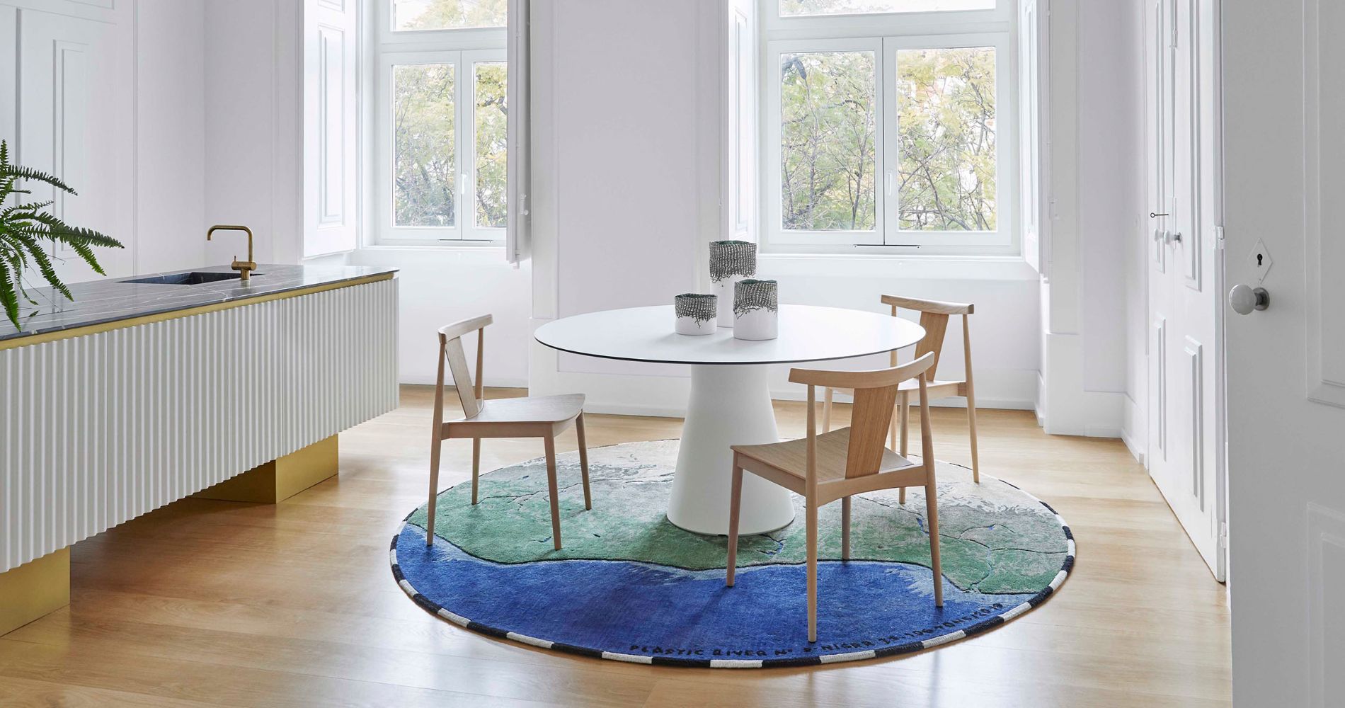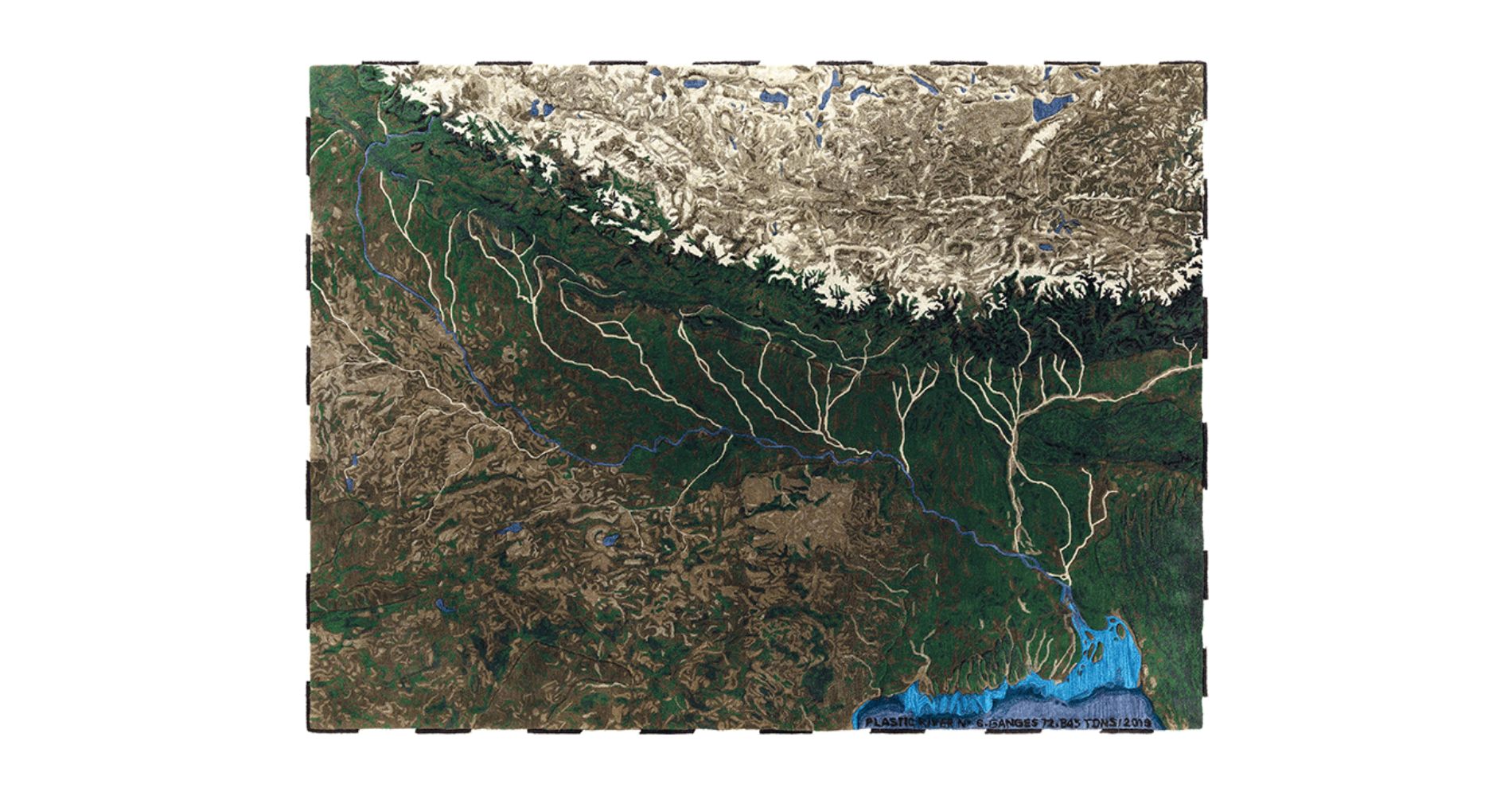 This collection of four rugs results from the shared goal of Álvaro Catalán de Ocón and GAN to raise awareness and combat, through craftsmanship, one of the great global problems of the industrial age: plastic waste. Each rug is a faithful and scaled representation of one of the most polluted and polluting rivers on the planet: Ganges, Yangtze, Indus, and Niger. The rugs are hand-tufted with recycled plastic fibers (100% recycled PET), a material that takes on a new meaning and highlights the paradoxical beauty of its origins: rivers, wonders of nature, which have been converted into landfills that carry thousands of tons of plastic into the oceans.