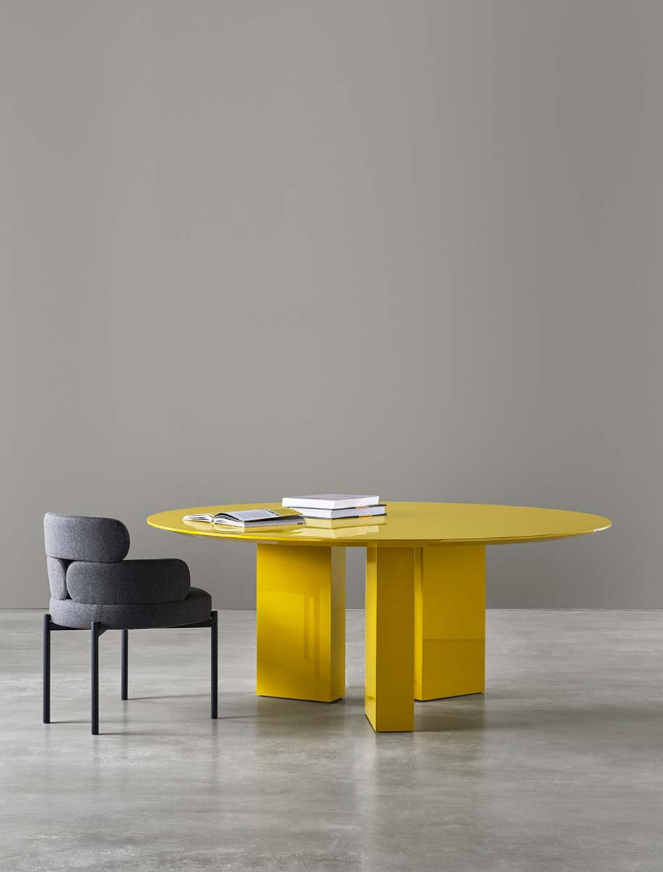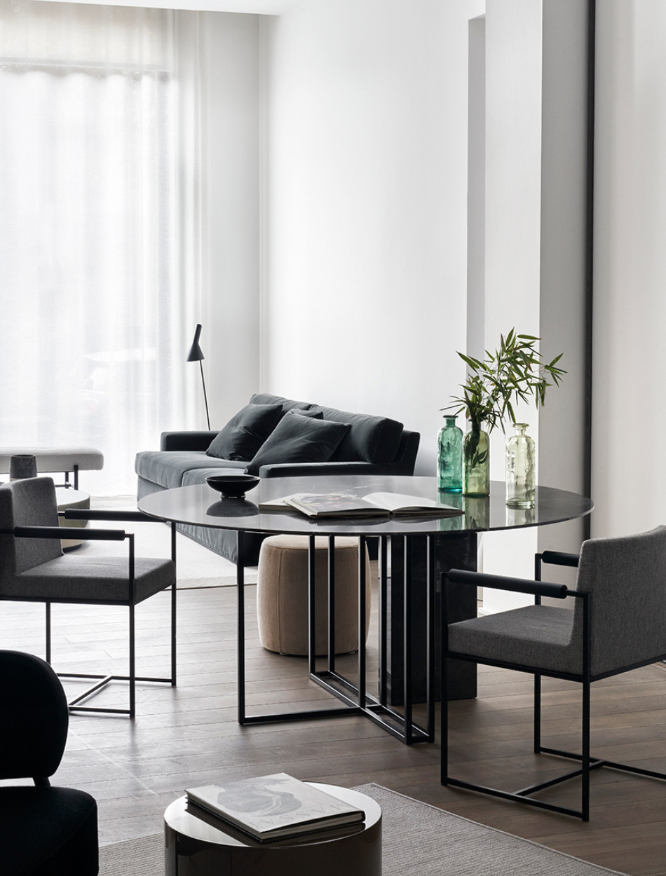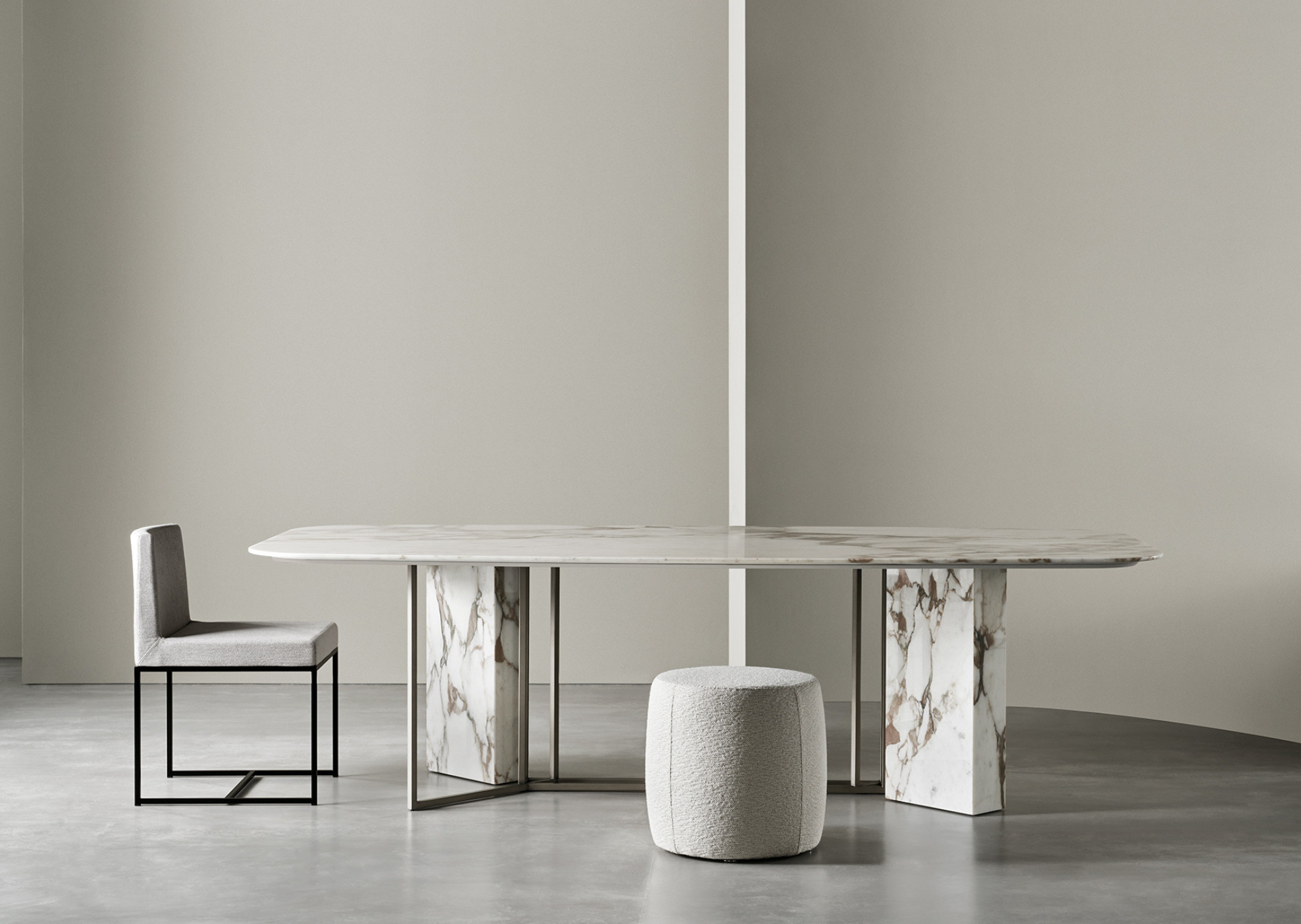 A shape and a name that recall stability and planning: from Latin ‘plinthus’, the Plinto collection refers to the architectural element that serves as a support for columns. A sculptural table marked by three elements: a monolithic base, a light structure and a top, each of them available in different shapes and materials allowing many different configurations. The versatility of this collection and its almost endless possibility of personalization mark this iconic collection, without forgetting the neat lines and a balanced design in each version.
