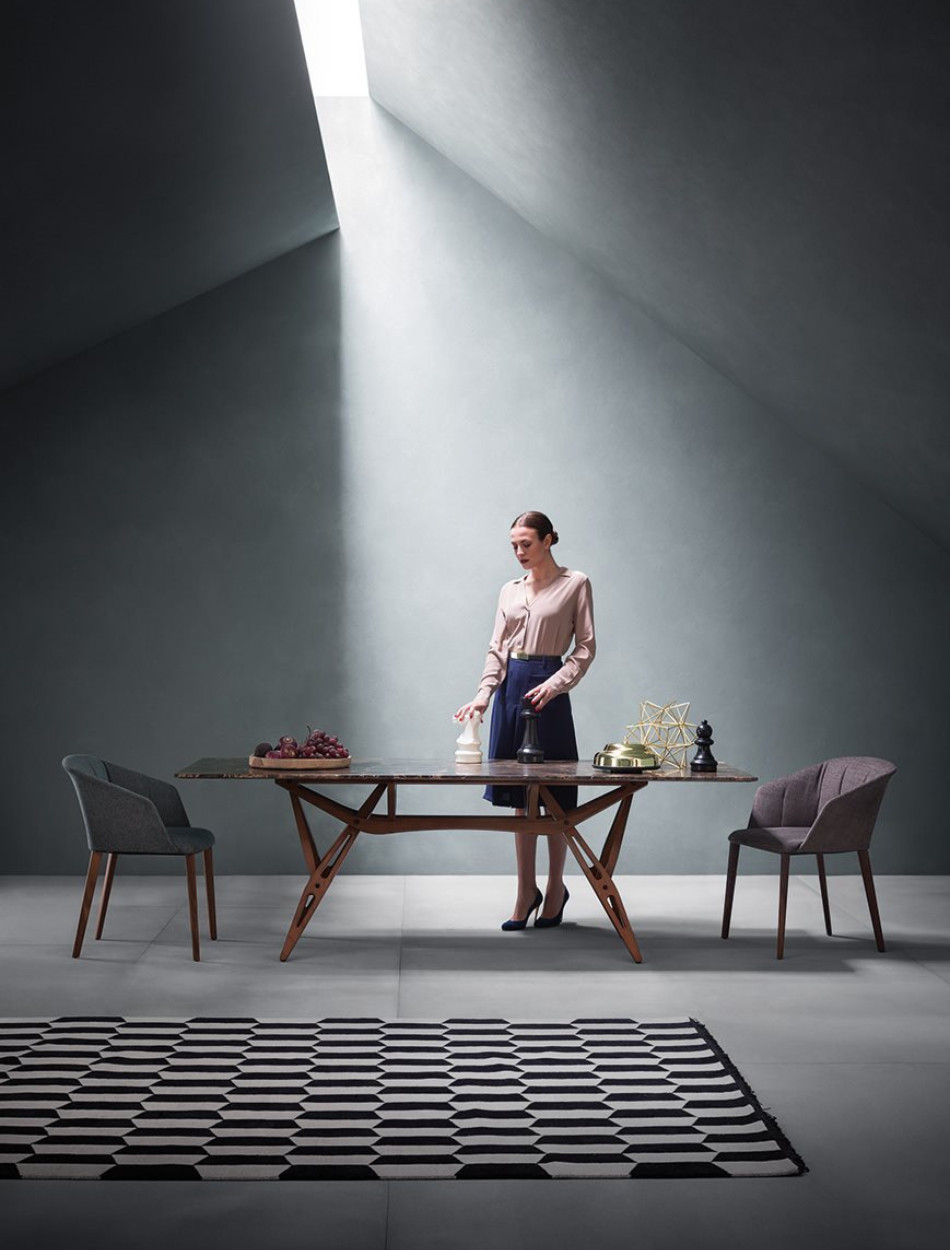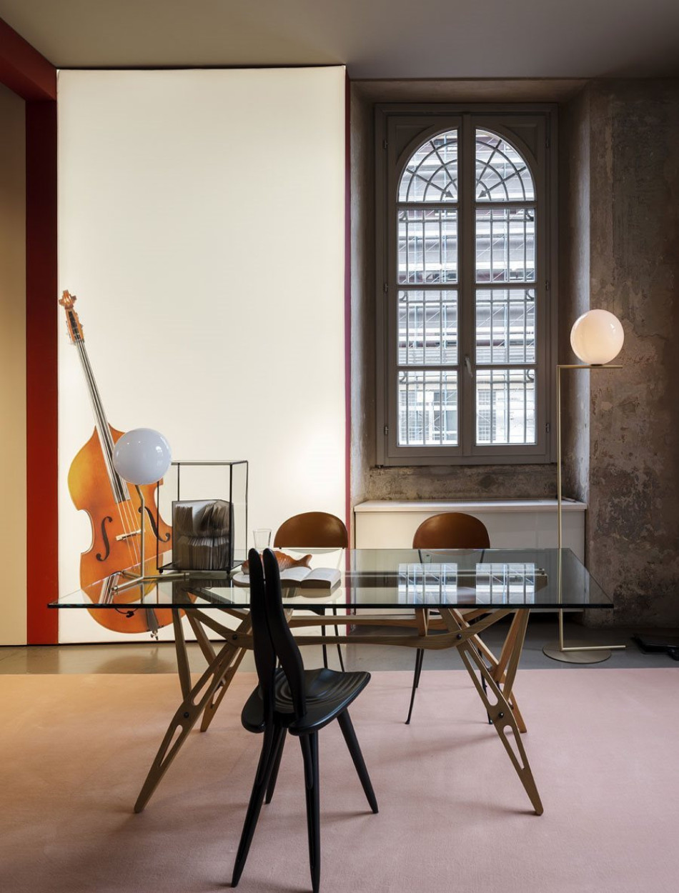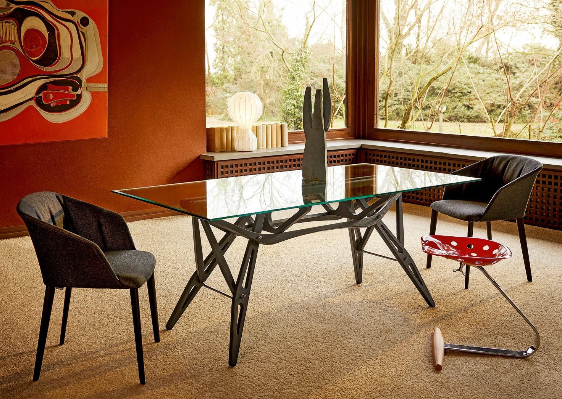 Articulate and complex shapes, but which once understood can astonish owing to the constructive intelligence of a perfect mechanism where every element slots together, matching, twinlike with precision to the others, through precise (and custom-design) metal joint systems. True masterpieces, like the Reale table, created with a compact, transparent skeleton embellished with a crystal top that seems to frame it.
