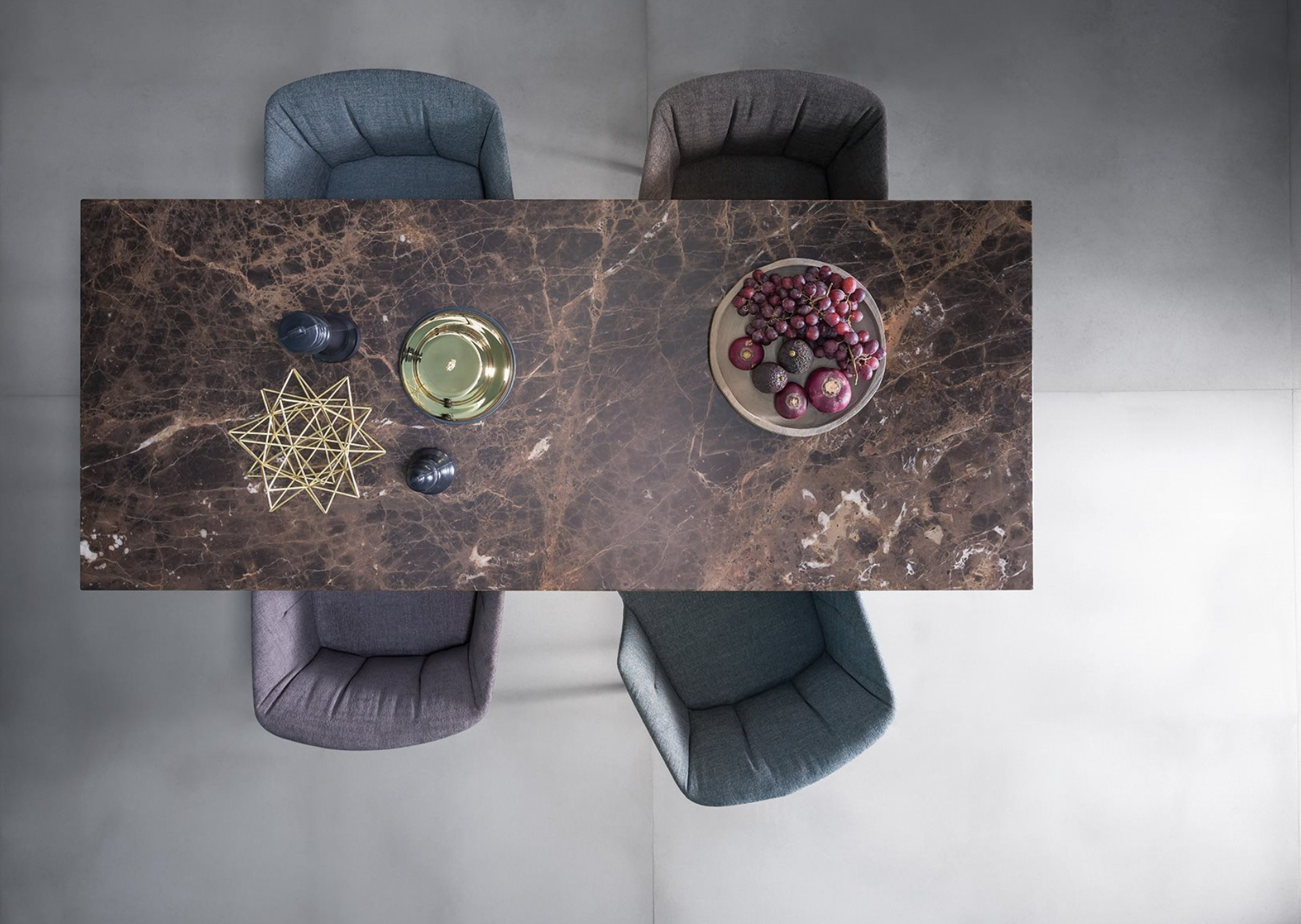 Table. Clear plate glass top, with or without bevelled edges or in Emperador marble, with stainresistant protective varnish, in clear matt polyester. Frame in solid natural or orange or black varnished oak, or in Canaletto walnut-dyed oak; wax-finished varnish.