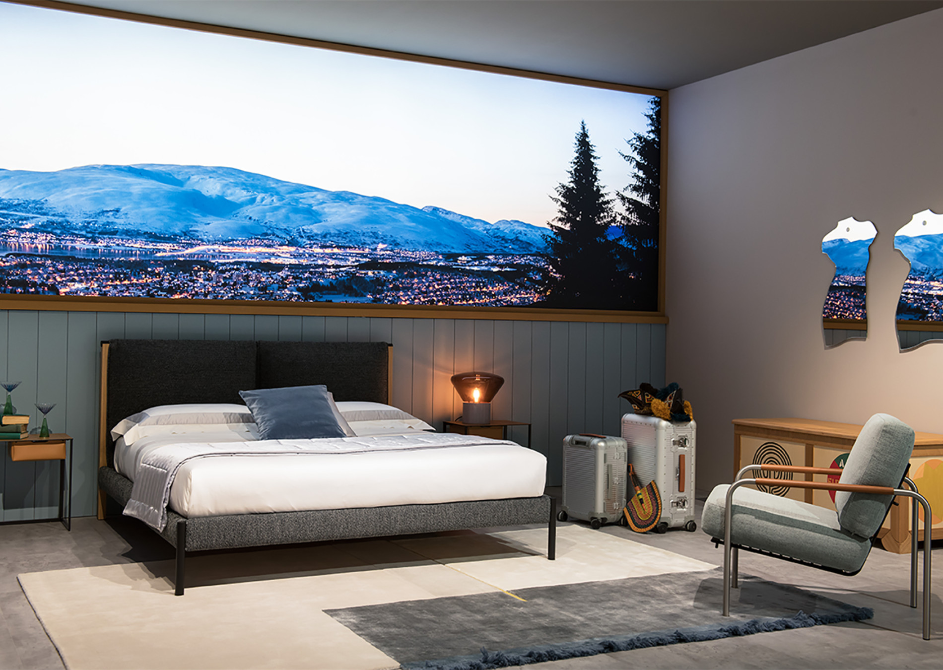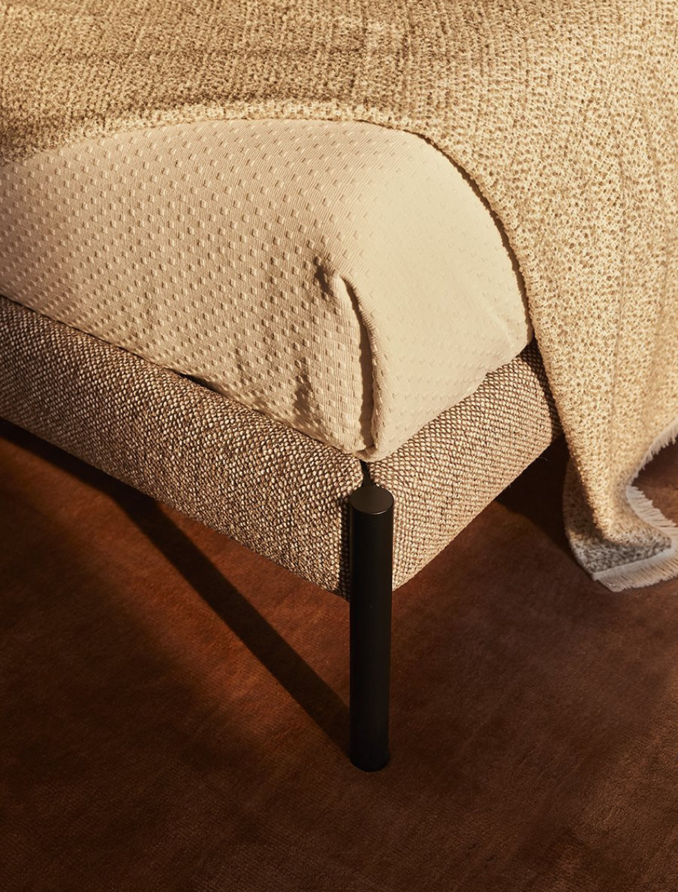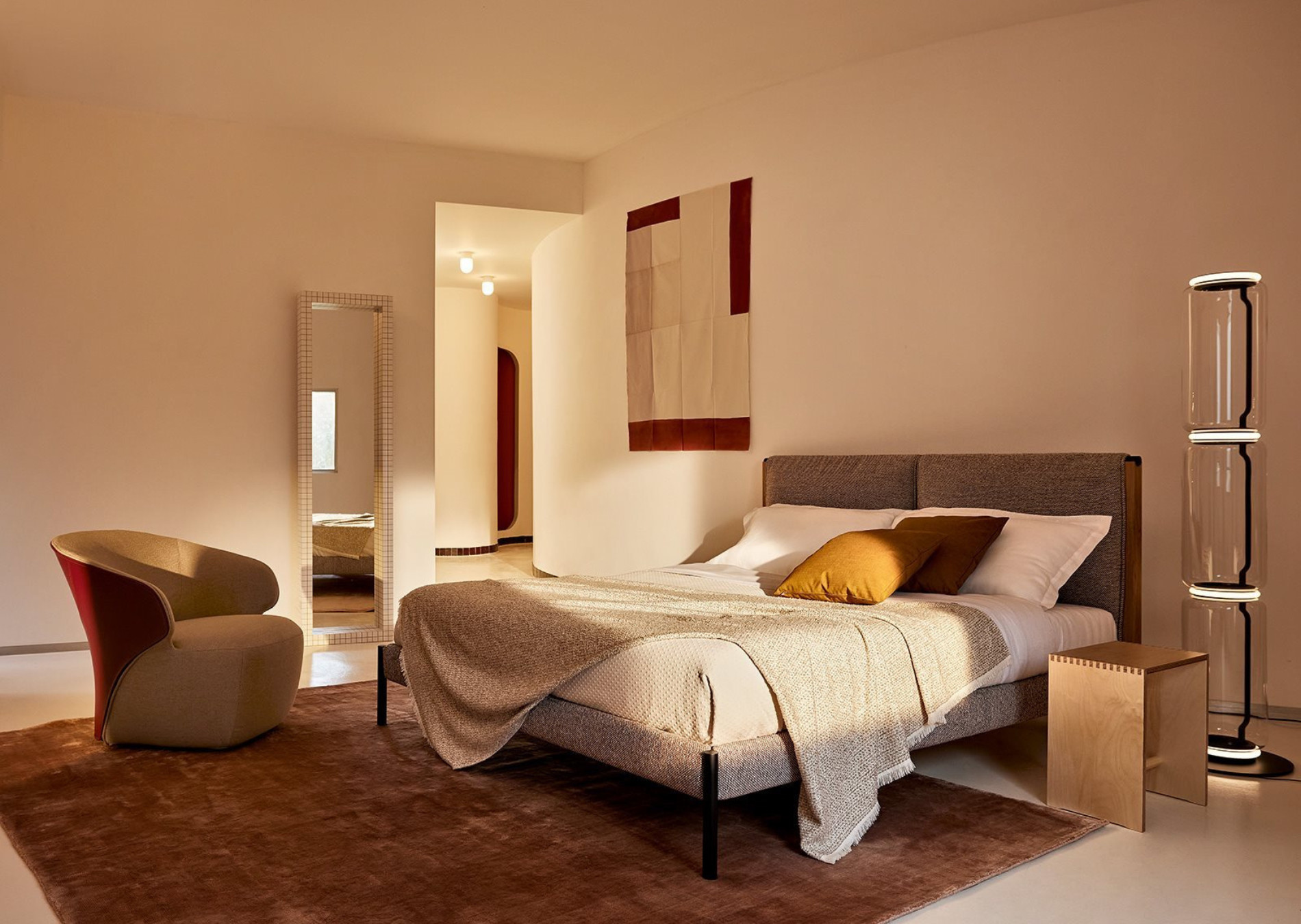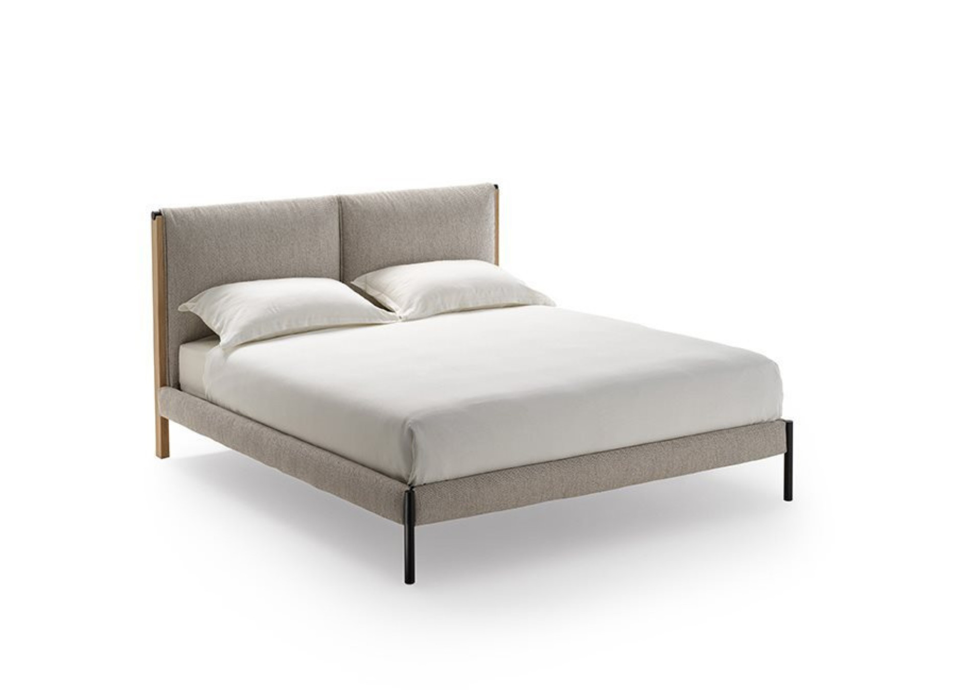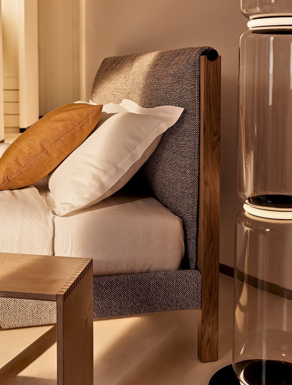 A bed with a simple structure and impeccable details, which describes the intimacy of life. The padded headboard gives comfort when reading, the horizontal rod and the feet are in matt black painted metal and fit softly into the natural or black-stained ash of the vertical uprights and the structure covered in fabric.