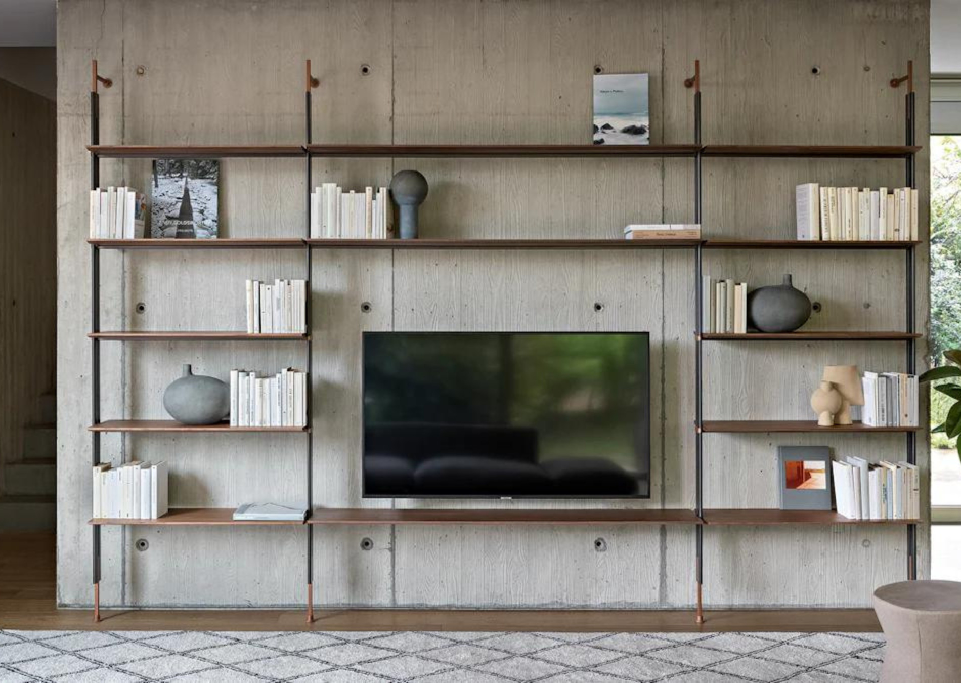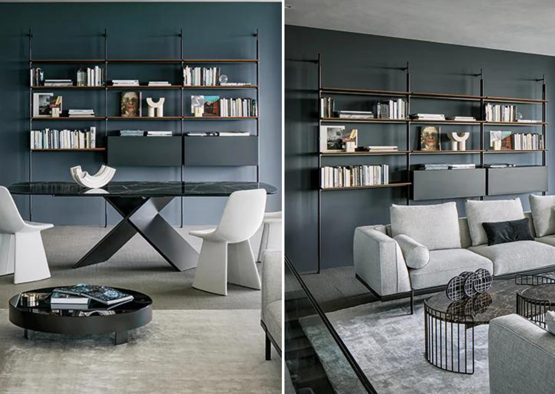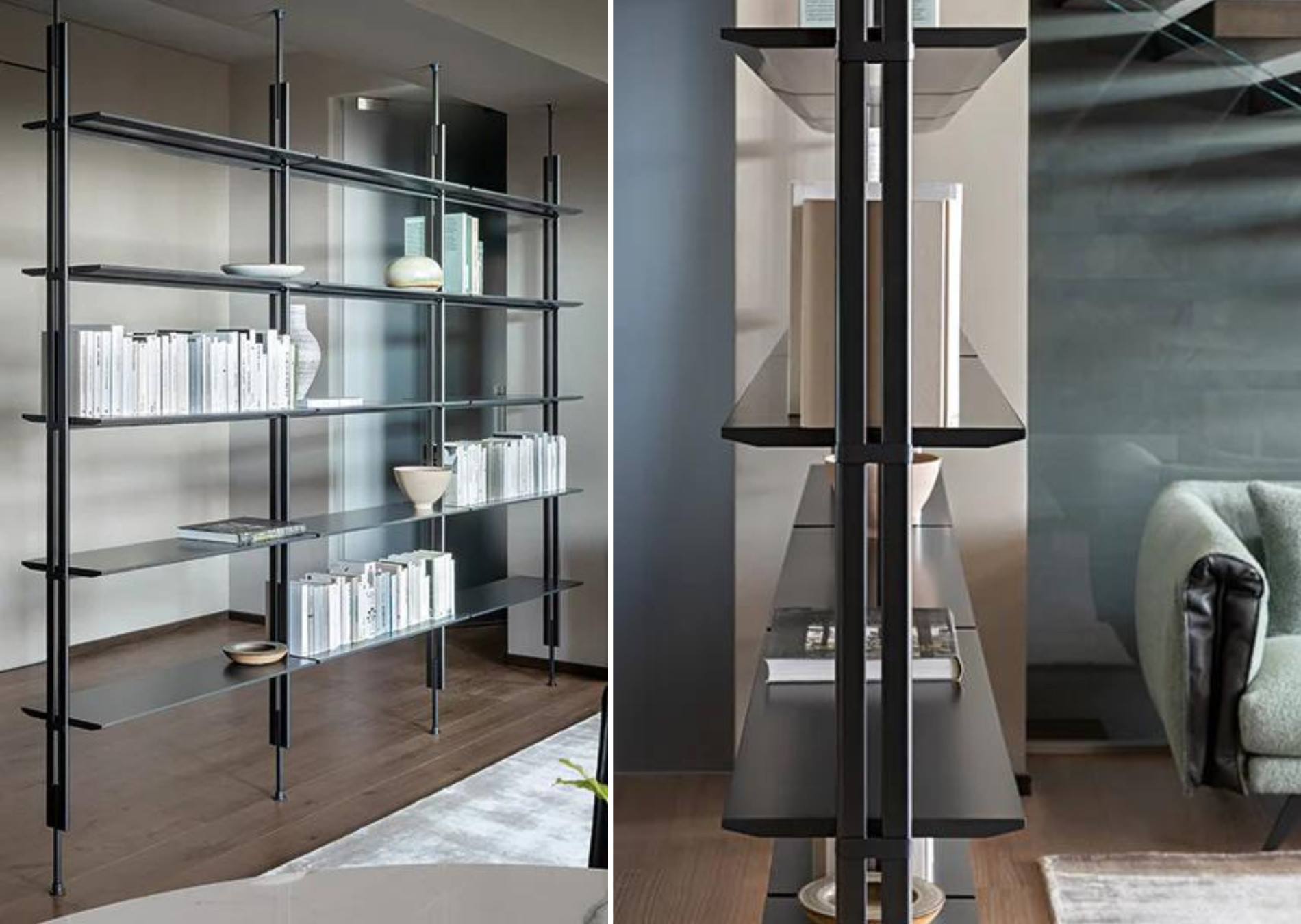 The ability to fix the Roll modern modular bookcase to the ceiling, as well as to the wall, makes it a furnishing element that can also be installed in the centre of a room to divide it into two spaces. Mounting it to the wall takes place by means of supports composed of metal tubes with a lead finish; both the shelves and the details that emerge from the metal tubes are available in the same finish as the supports, or in different finishes for a play of contrasts of utmost elegance. The modularity of the modern Roll bookcase makes it suitable for any size of wall, both in the home or office. A box module is also available, to store objects and books.