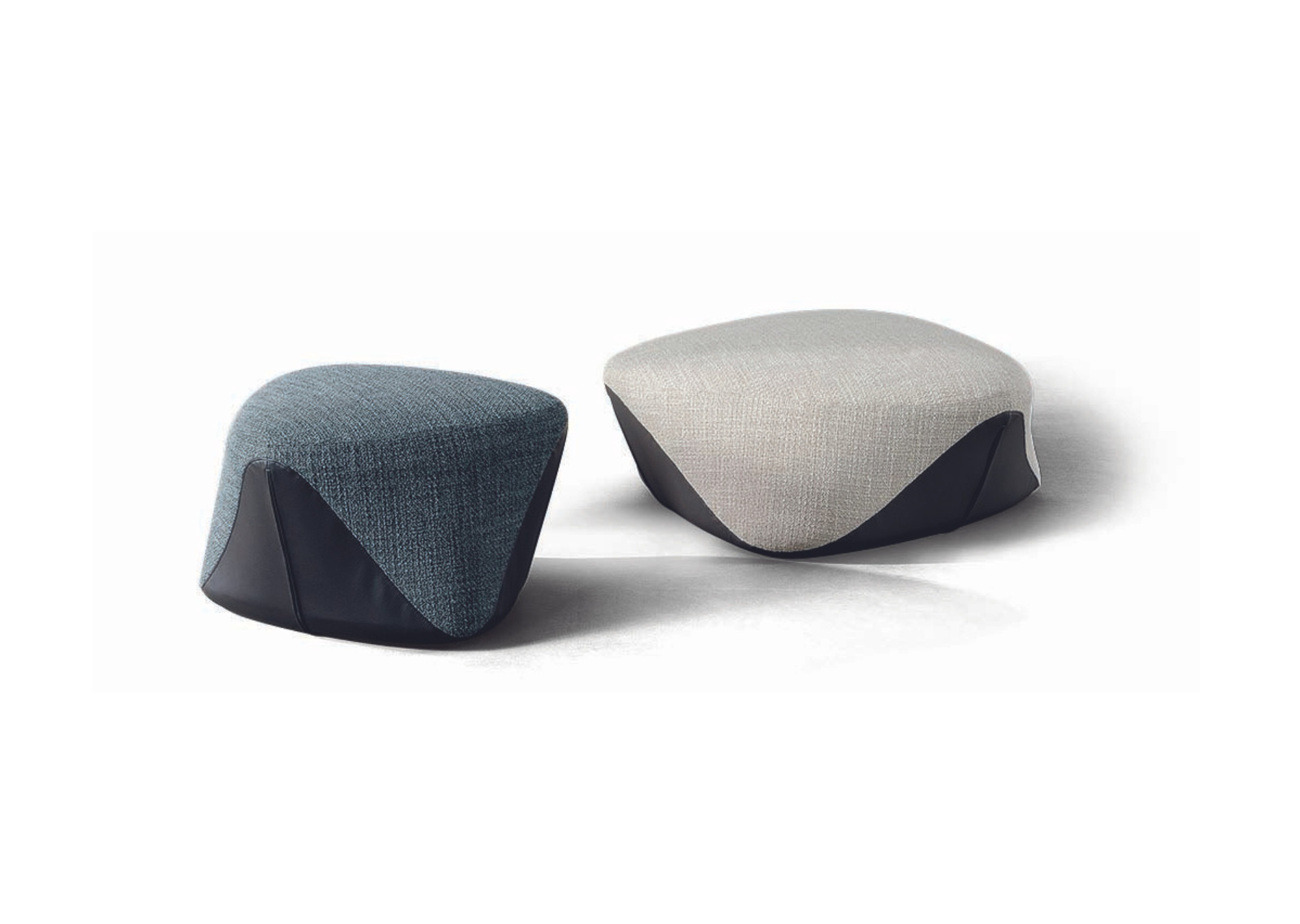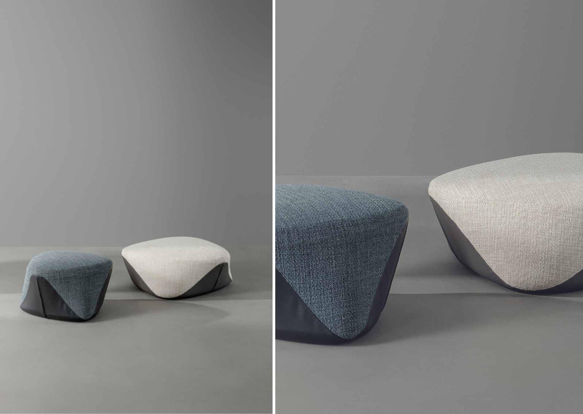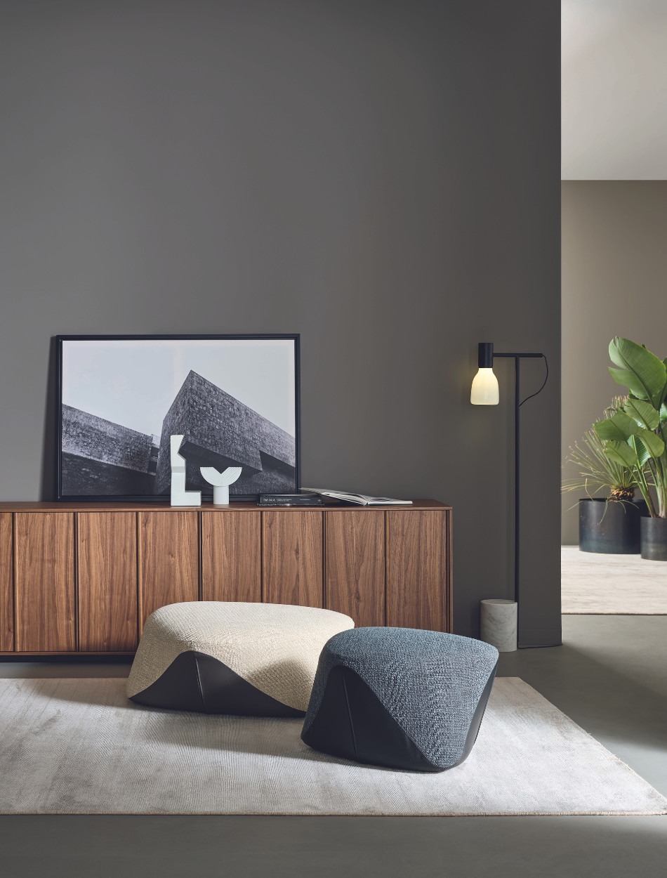 The Seki modern floor poufs, reminiscent of stones polished by the wind and rain, create a sculptural, eye-catching shape which fits seamlessly into any space. Due to the absence of edges and right angles their seemingly irregular frame takes on different shapes depending on the angle from which they are observed. The cover, divided in half by a curved line, makes it possible to play with different materials: the lower part, in contact with the floor, recalls the shoreline, while the upper part reproduces the shape and faces of the stone. The Seki poufs are available in two sizes and can be upholstered in fabric or leather; it is also possible to choose the version with covers in two different colours or materials.