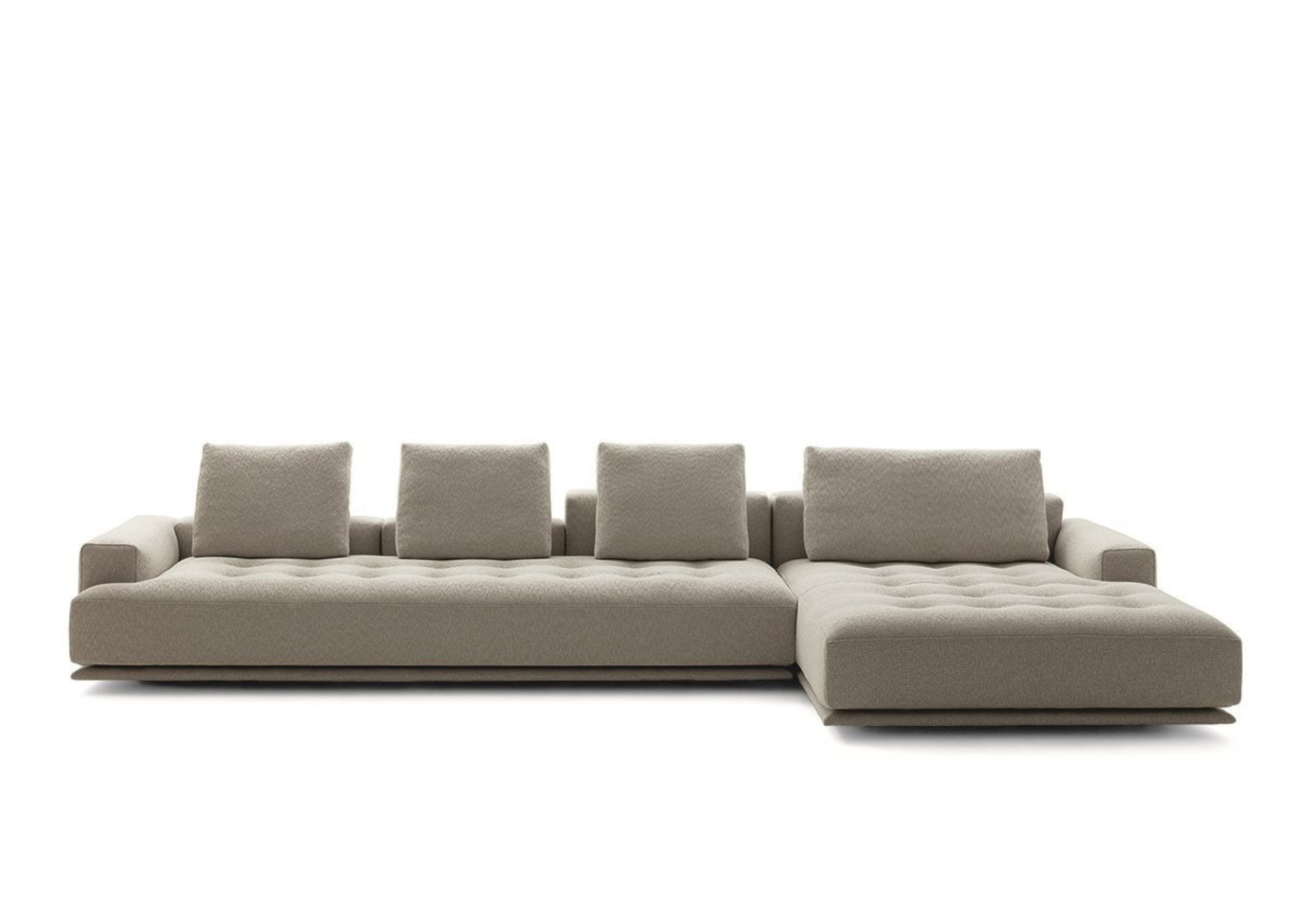 Inspired by the spare simplicity of the traditional Japanese futon, this sofa evokes the appearance of a thick padded mattress resting upon an upholstered wood base. The refined, quilted motif delimits the generous seat cushion, embellished by the sartorial detail of hand-made toggles in nuanced shades of the upholstery. The design is characterised by the dynamic alternation of different thicknesses and heights, mimicking an urban skyline, an architectural composition created from harmoniously contrasting materials, finishes and volumes.