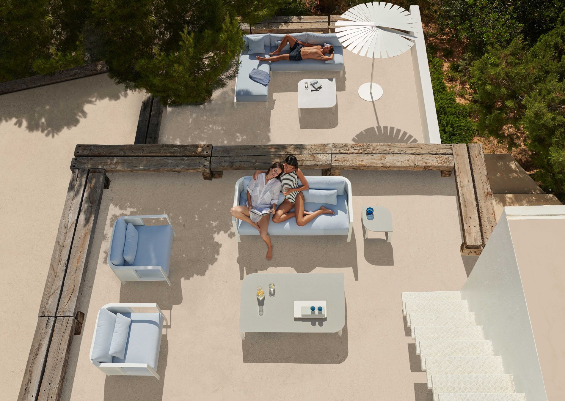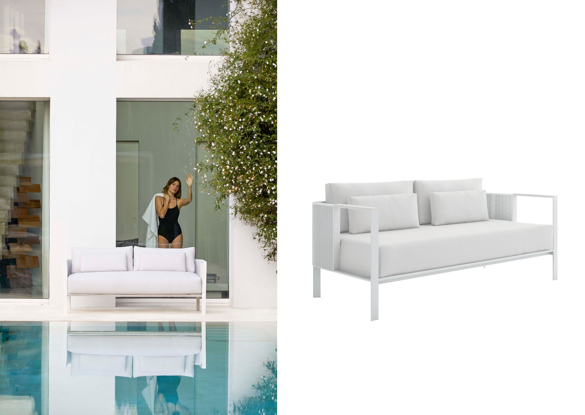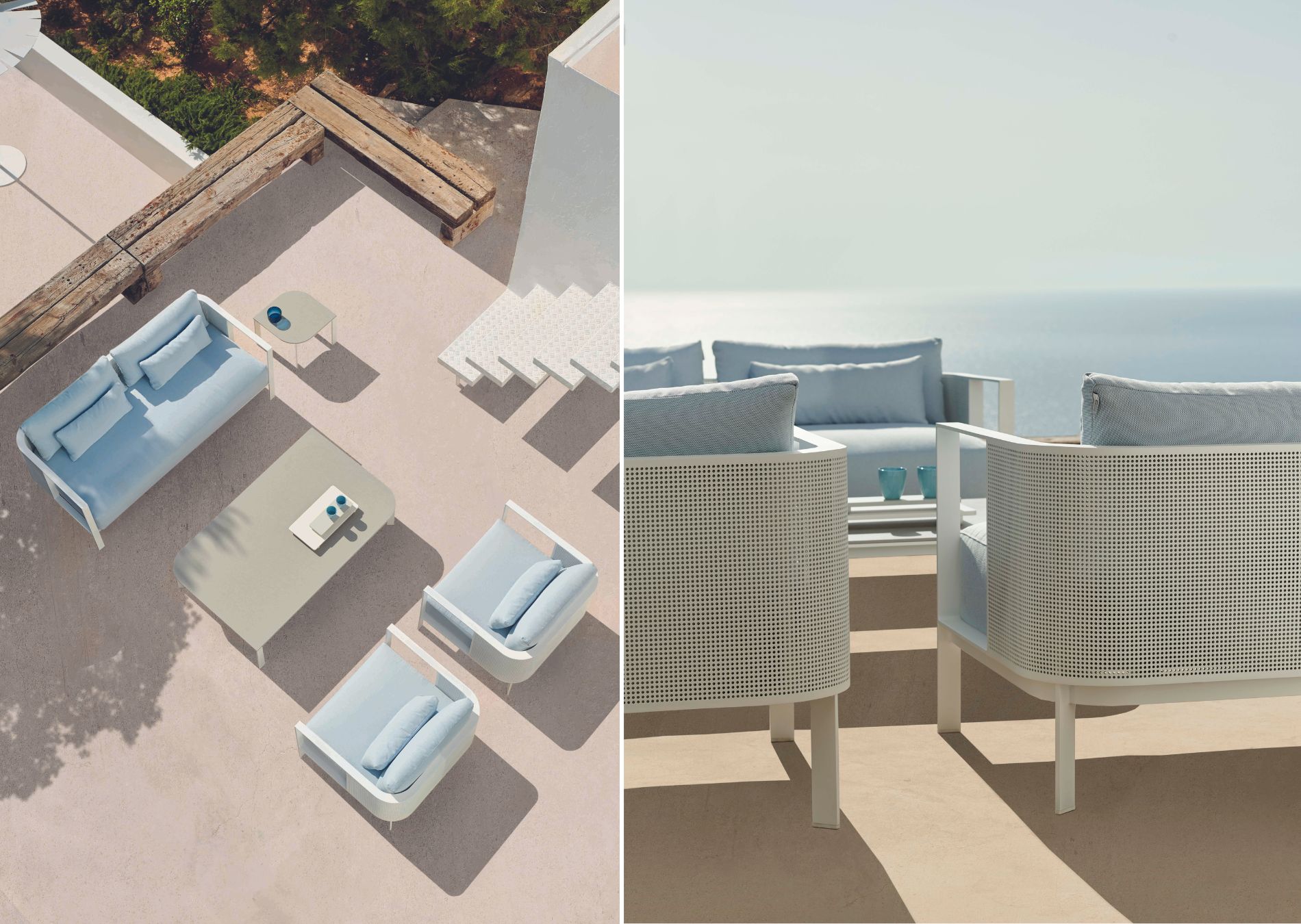 The SOLANAS 2 seat sofa completes the collection, perfect for residential terraces and larger contract projects. It is a designer sofa made of aluminium, the brand’s fetish material, welded to a curved micro-perforated sheet; as well as the ultra-resistant material Dekton® by Cosentino.