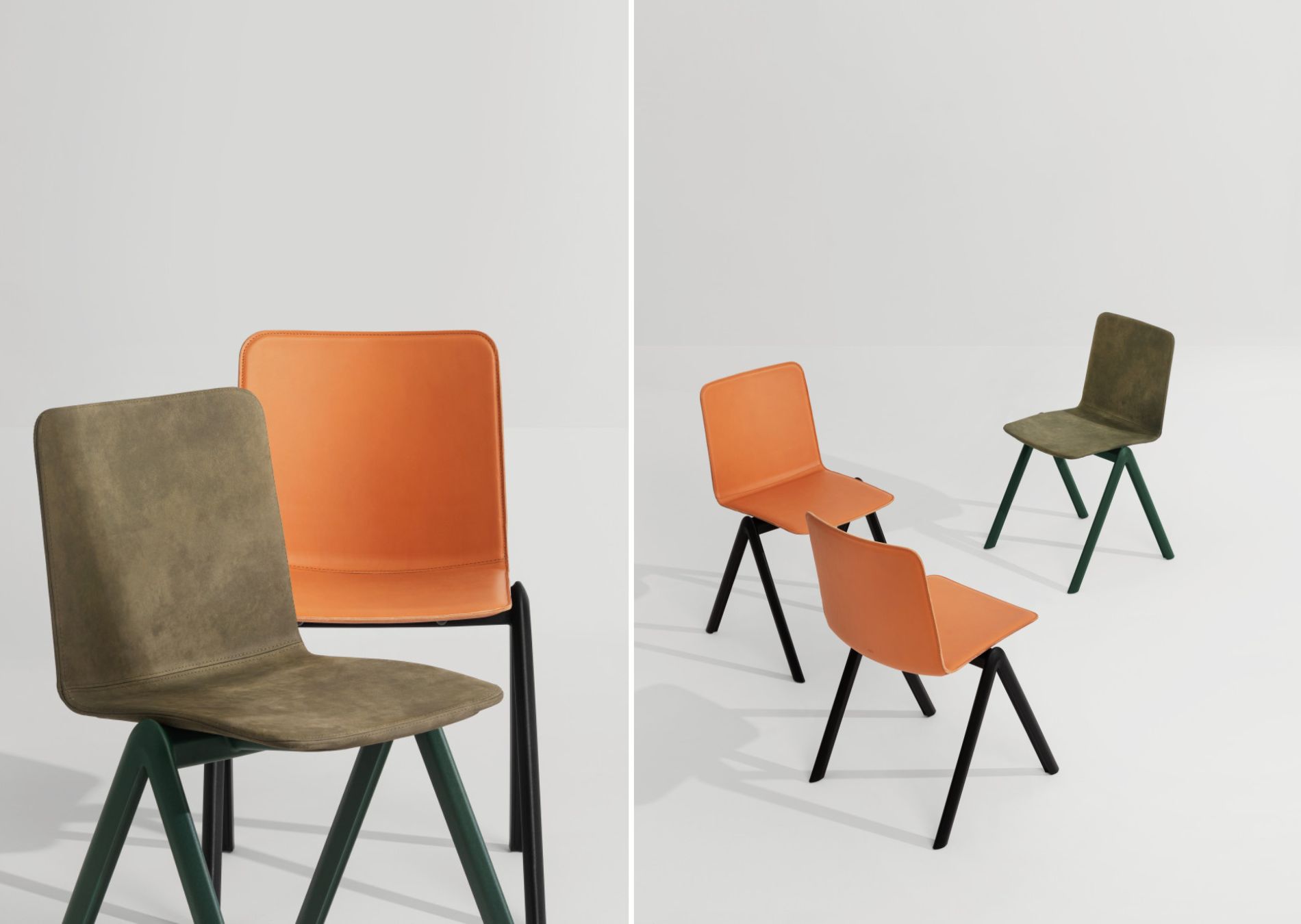 The shell, in addition to the polypropylene version, is available in wood, upholstered in fabric, leather, faux leather or hide. Also available only with the upholstered seating version.