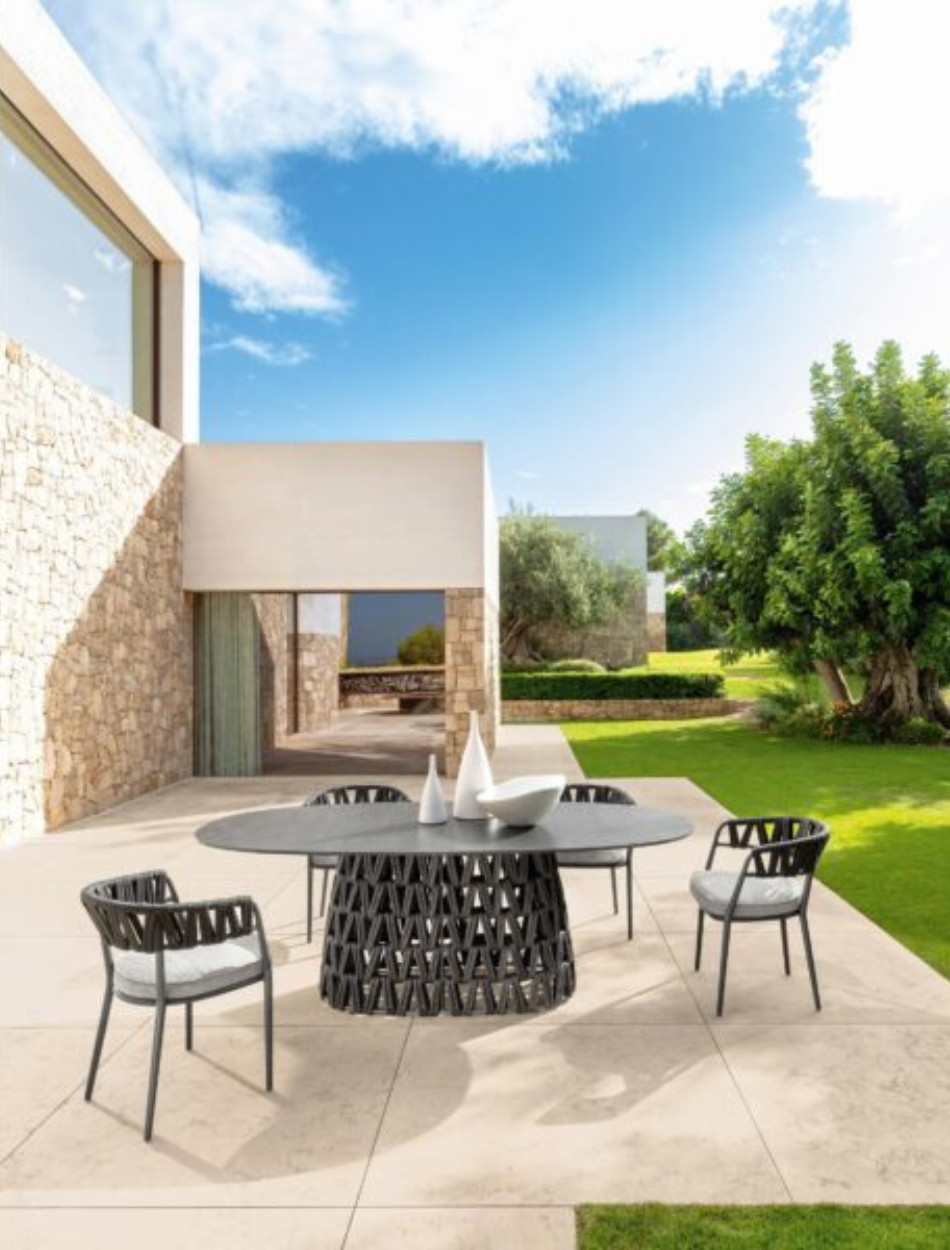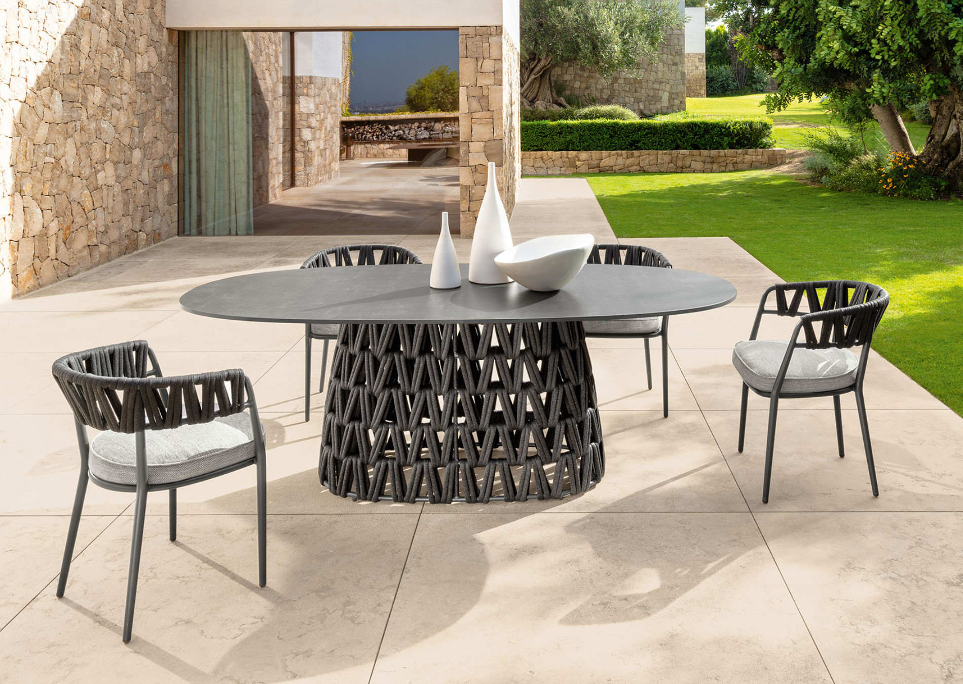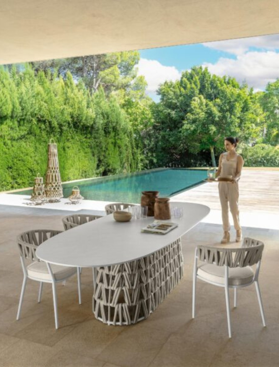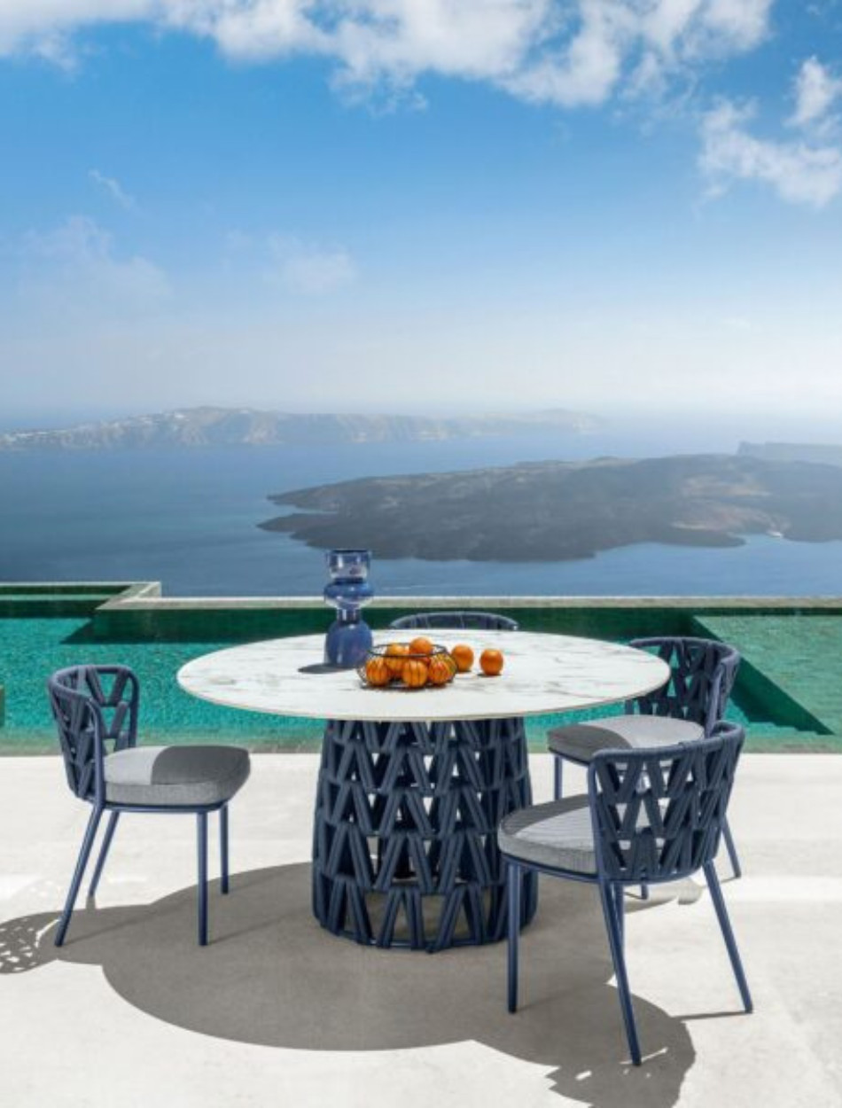 Swipe dining table combines lightness and conviviality thanks to the playful design of the various elements that compose it. Inspired by the concept of movement, this design element is distinguished by the thin stoneware top that seems to float thanks to an agile play of transparencies, given by the woven padded rope that hides the solid aluminum structure. The geometric pattern of the base reflects a graceful atmosphere to the garden and outdoor living.
