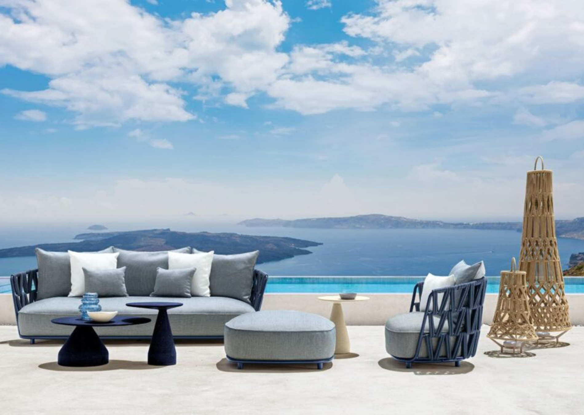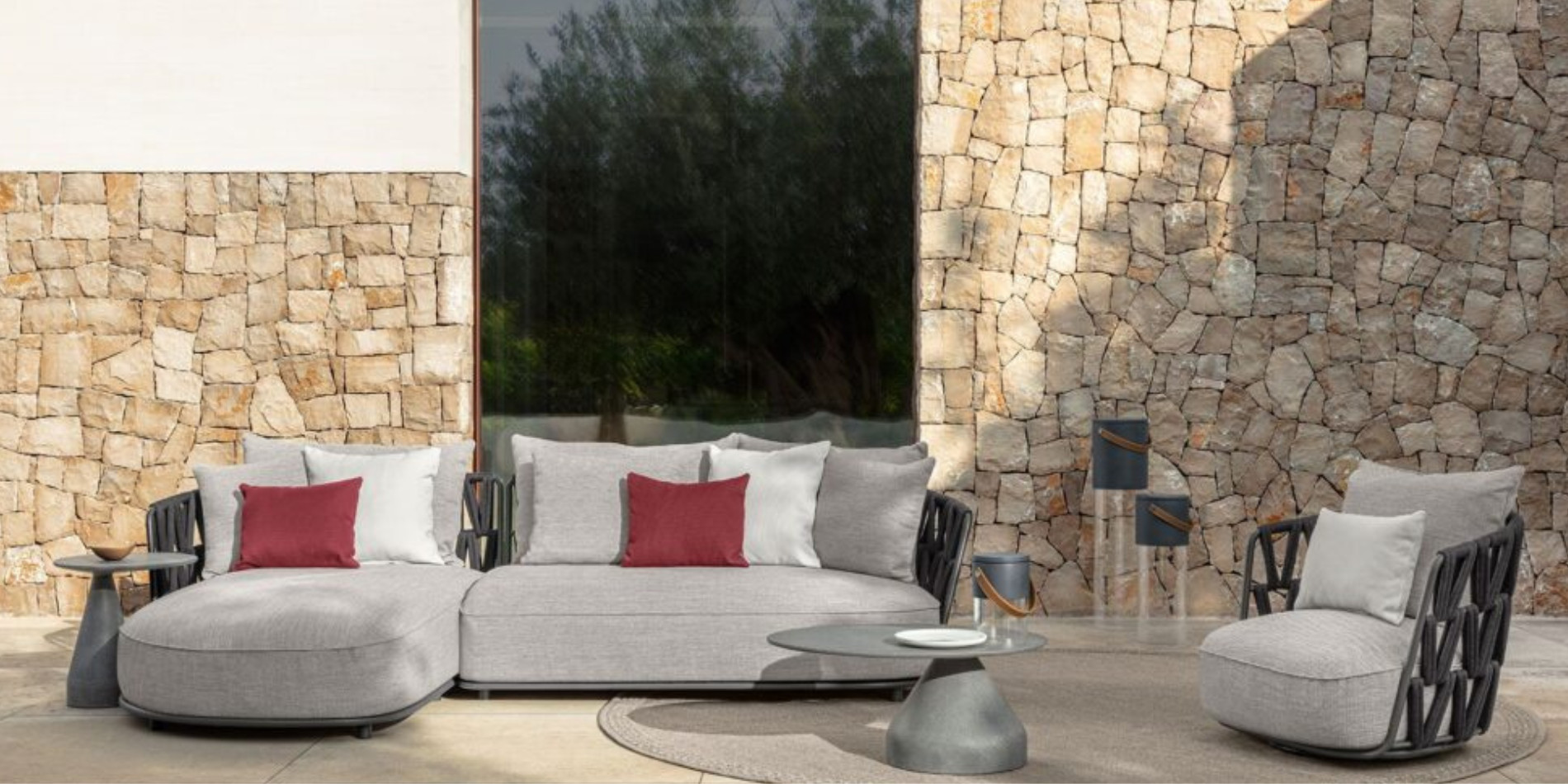 Swipe 2-seater sofa expresses lightness and movement through a design with a strong personality. The aluminium backrest, enriched by a dynamic padded rope weave, embraces the generous cushions, characterized by soft lines. This piece of furniture makes the outdoor living room comfortable and welcoming, giving unforgettable moments of shared relaxation. Available in a wide variety of colours, the Swipe sofa is versatile and adaptable to any outdoor context.