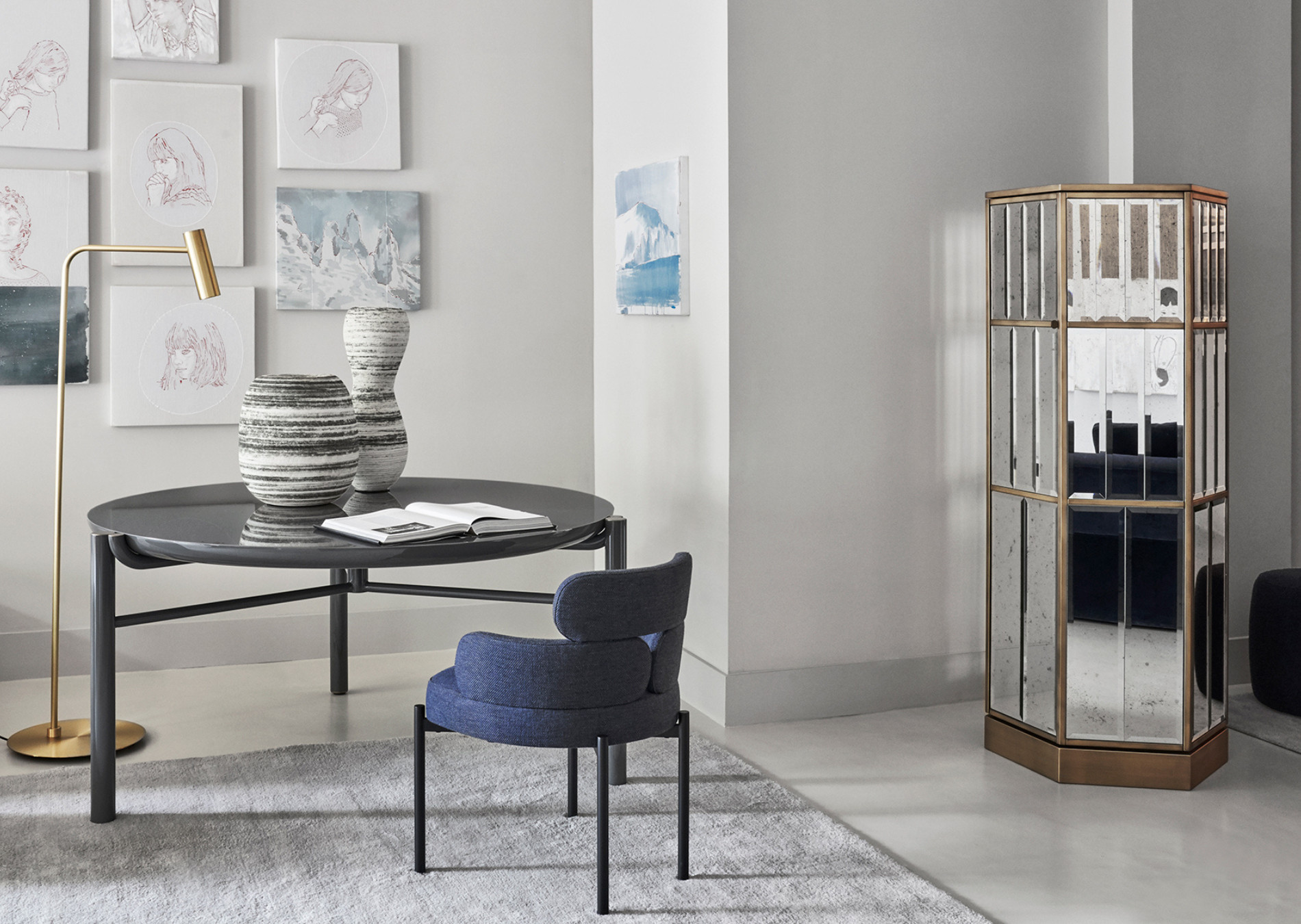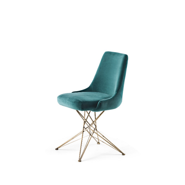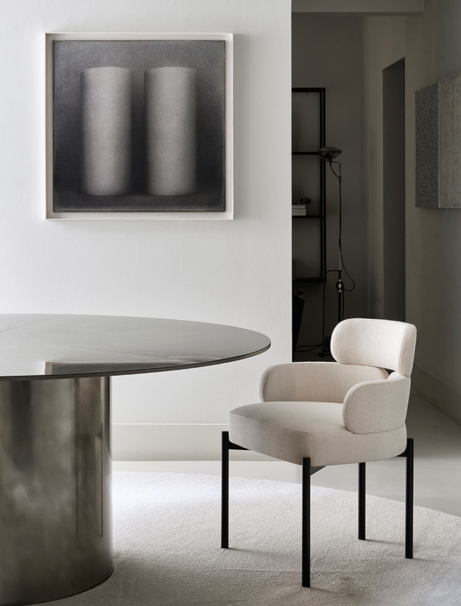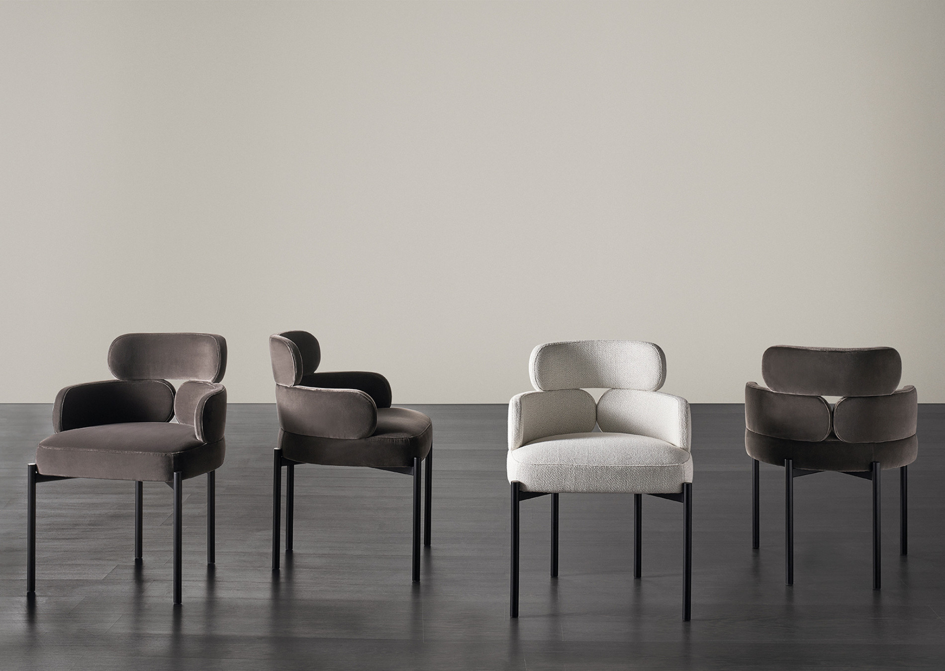 Sylvie is a chair with a rounded and enveloping backrest, characterized by three volumes that together create a perfect balance between geometrical shapes, art déco inspiration and comfort. The base consists of a matt black varnished tubular metal frame, that lightens the overall appearance, giving the impression that the seat floats in the air.