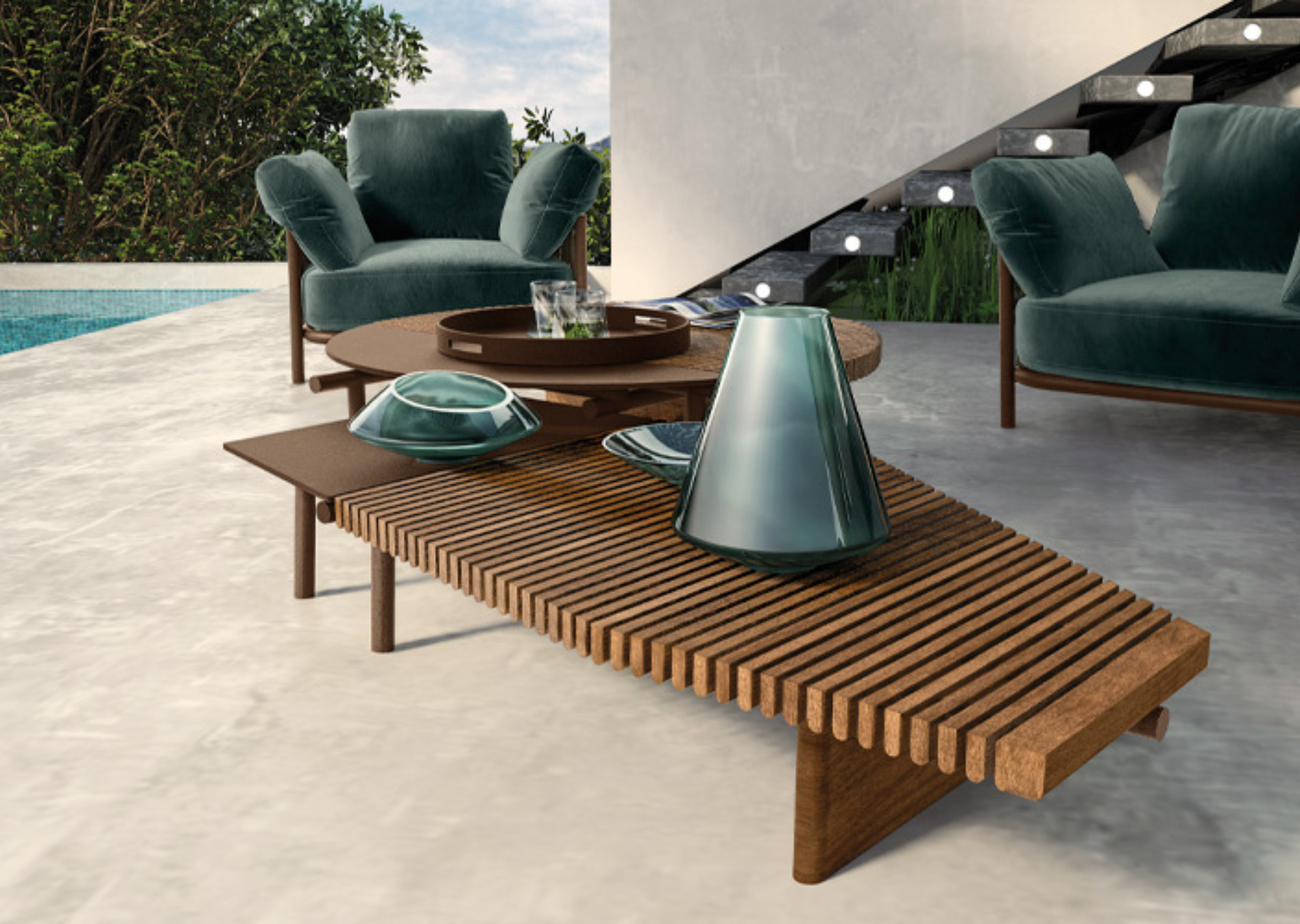 Polygonal shapes and irregular circles are generated by contrasting elements, in abstract graphic compositions at once dynamic and elegant. Composed of closely set lines in solid wood, the tabletop showcases solar forms and cutouts in surfaces with two different finishes: one in Corten stainless steel, the other in enamel. The particular features of these materials create the expressive lexicon for Talamone.