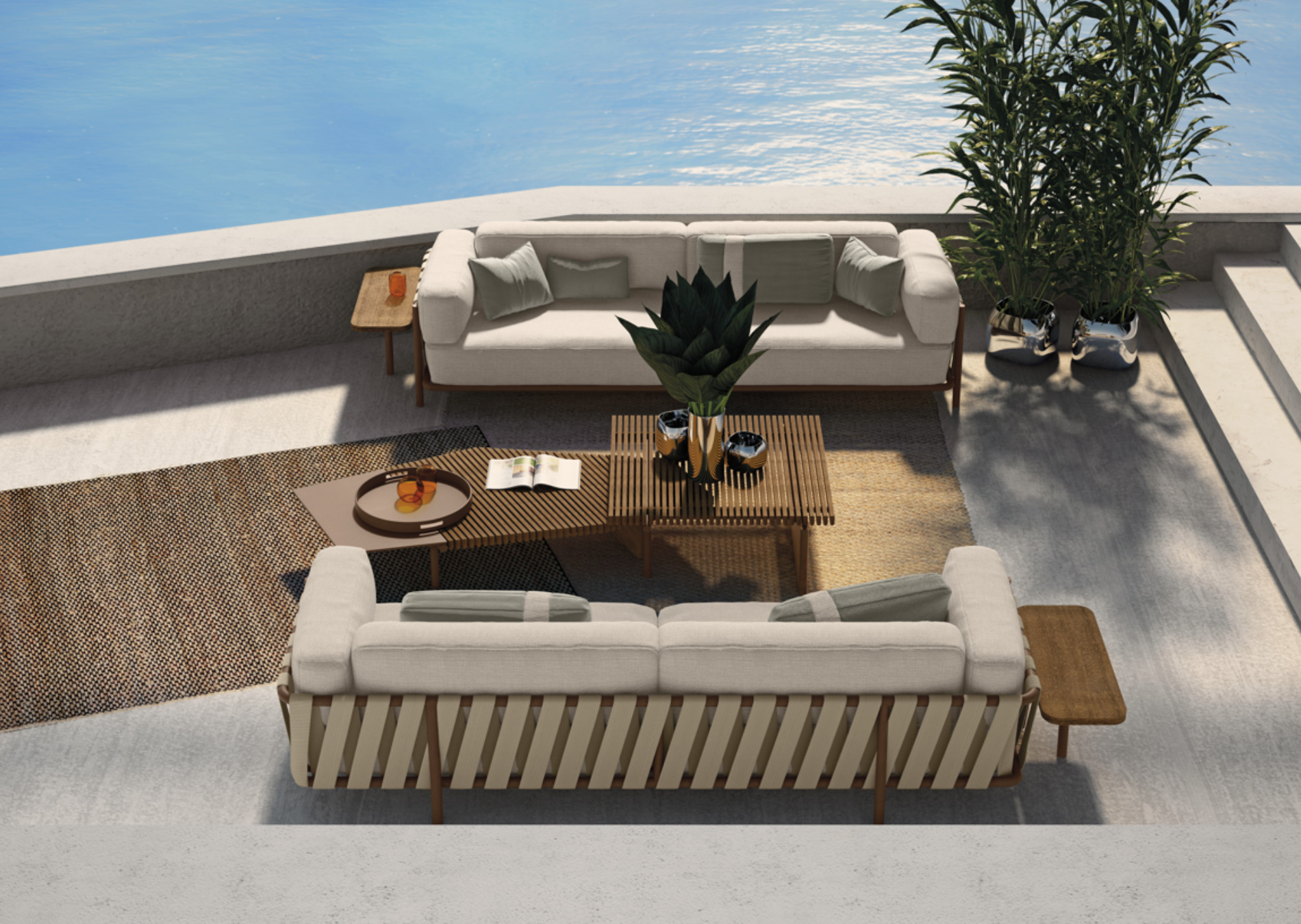 A personal, idealized interpretation of the Mediterranean ambiance comes into contact with lilting oriental nuances, resulting in a layering of chromatic signs and accents, all signatures of the multicultural language of our time.