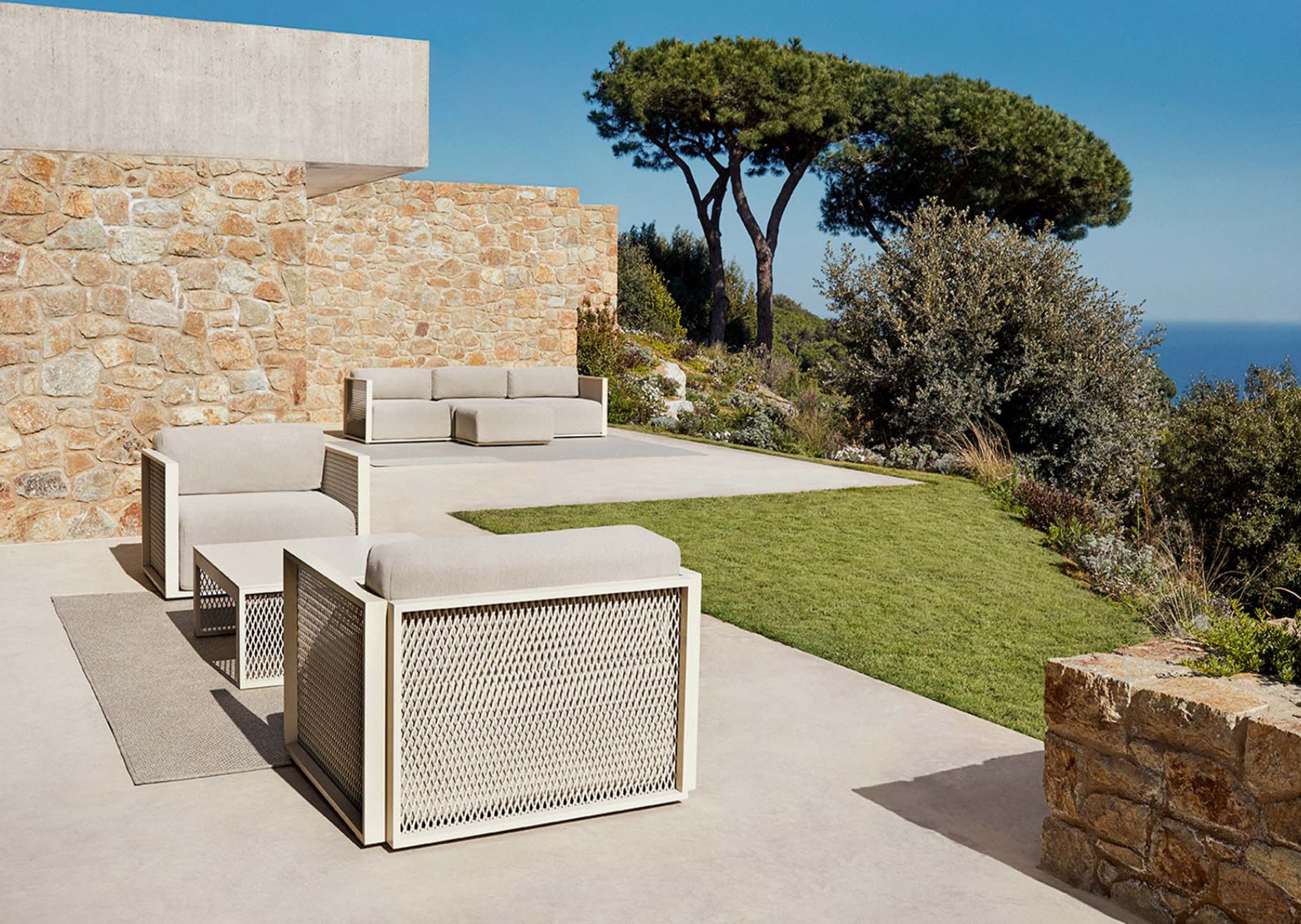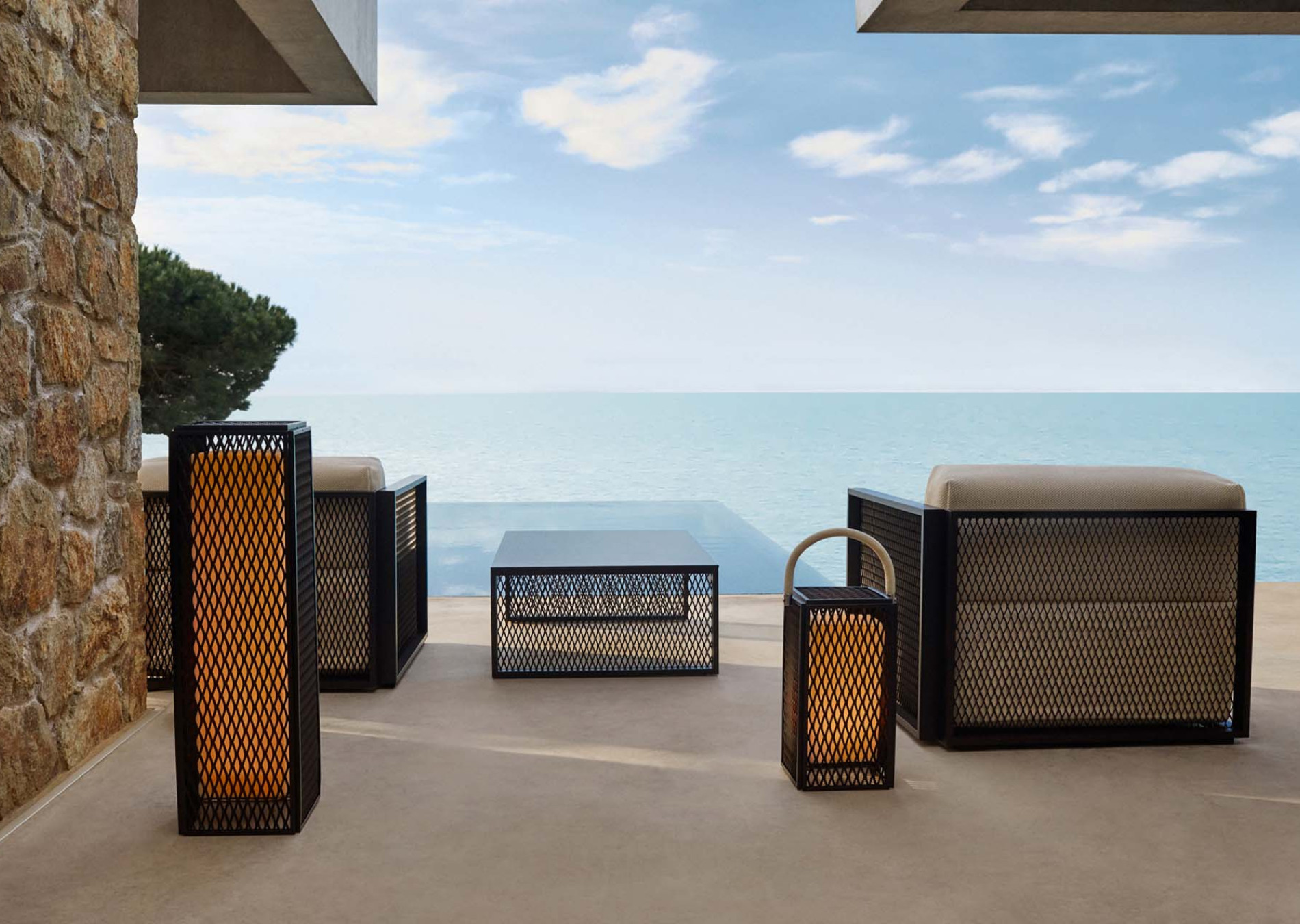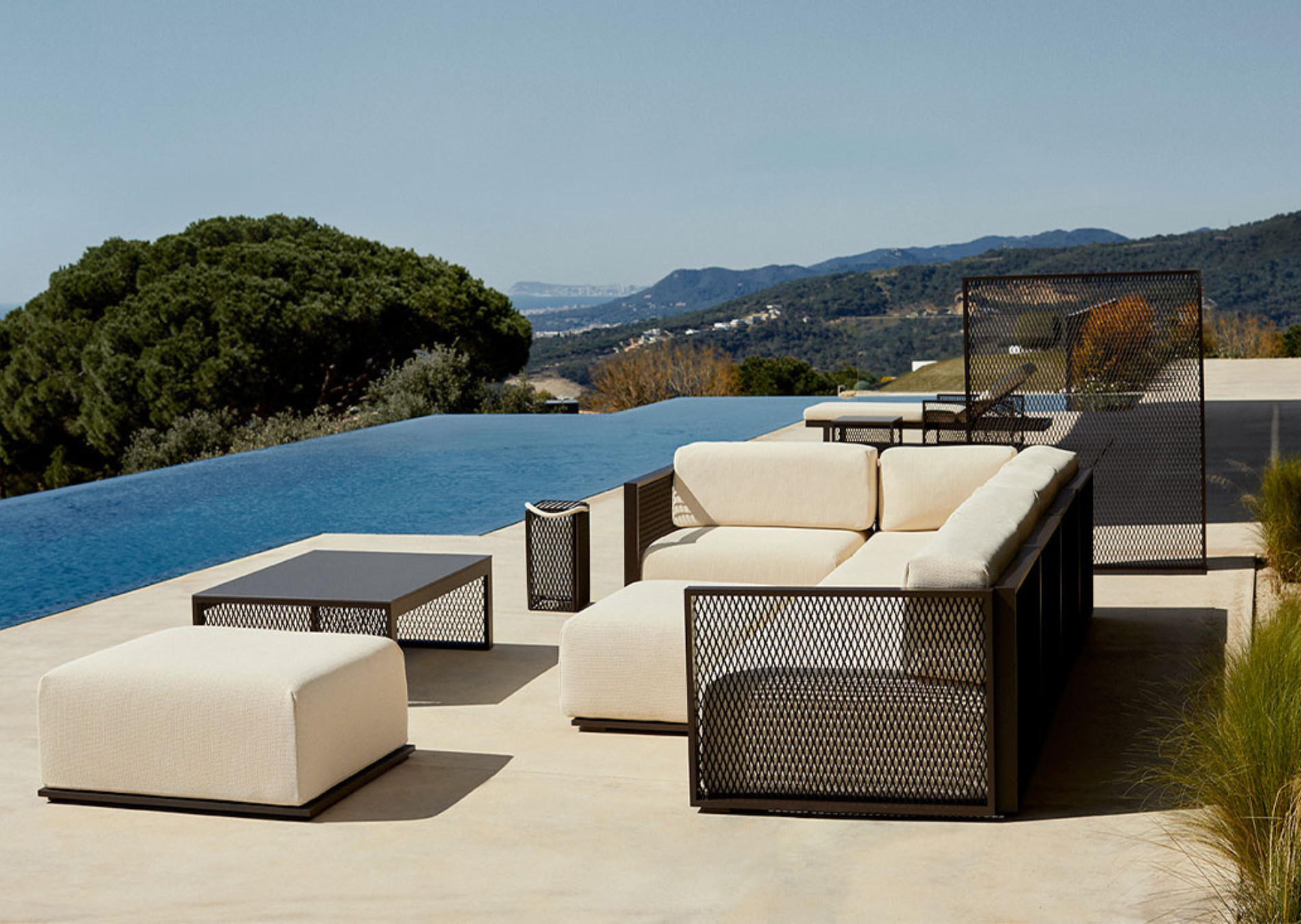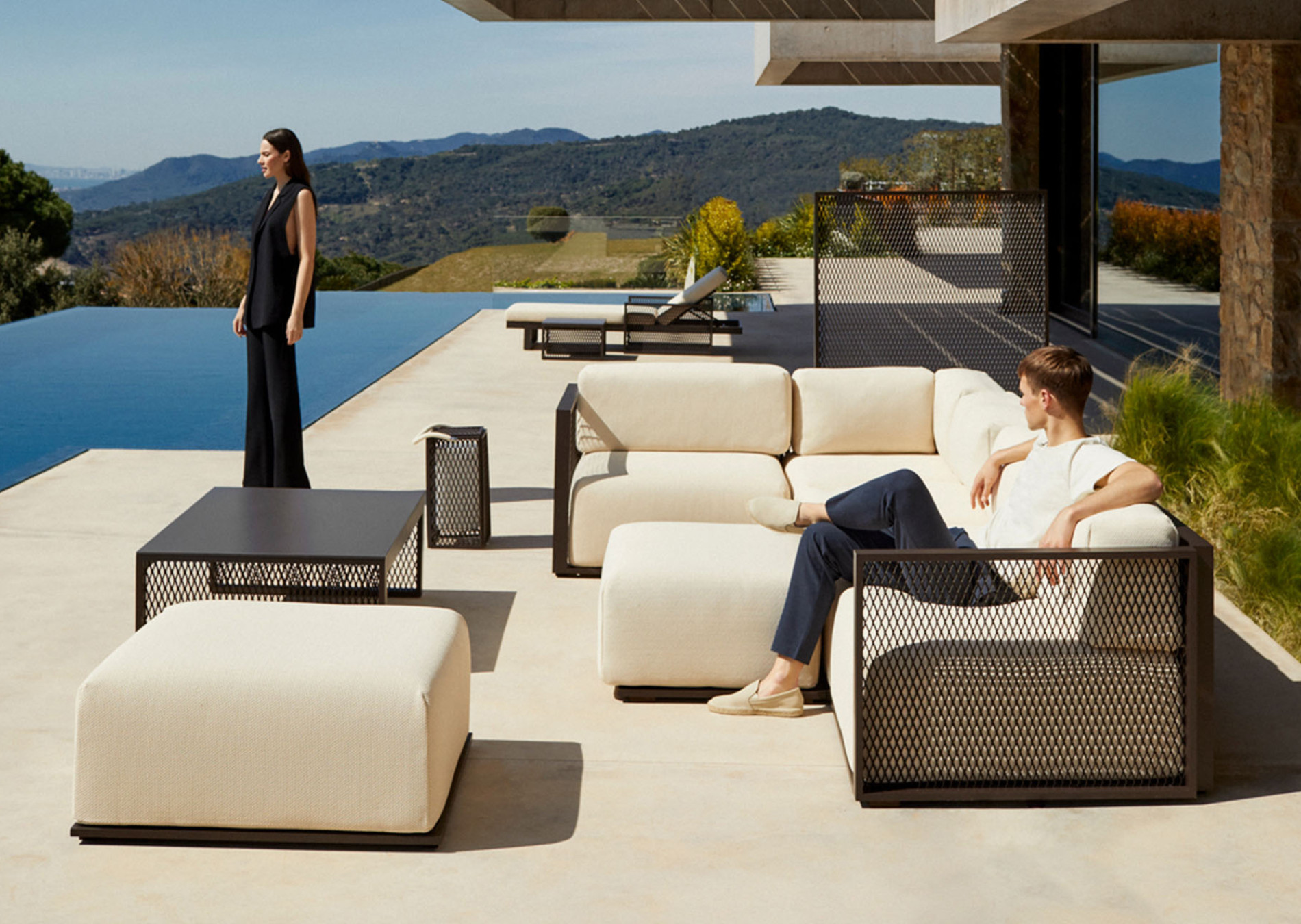 The Factory Collection, designed by Ramon Esteve for Vondom, is characterized by the aluminum profile and the “deployé” mesh. Discover this collection of aluminium furniture composed of a modular sofa, an armchair, a lounger, a side table, a lamp, a coffee table, a high table, chairs, and a room divider.