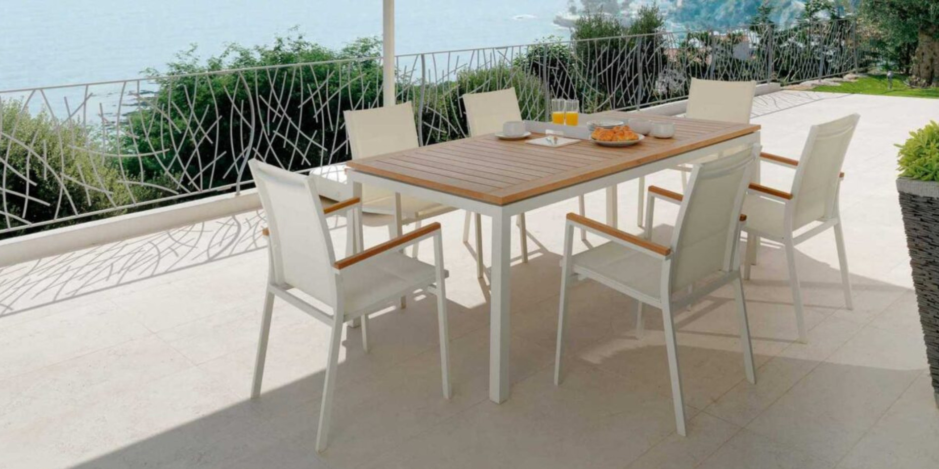 Curious realization and nice combination of materials, the Dining Armchair of the Timber collection is perfectly in line with the design and the warmth of the other products of the collection. The structure in aluminium, the seat and backrest in textilene in the same colour and the armrests, made of teak, create a pleasant contrast between modernity and tradition. Available in two colours (white and dove-grey), the Armchair is comfortable even in the coldest periods thanks to its stackability that makes it easy to store.