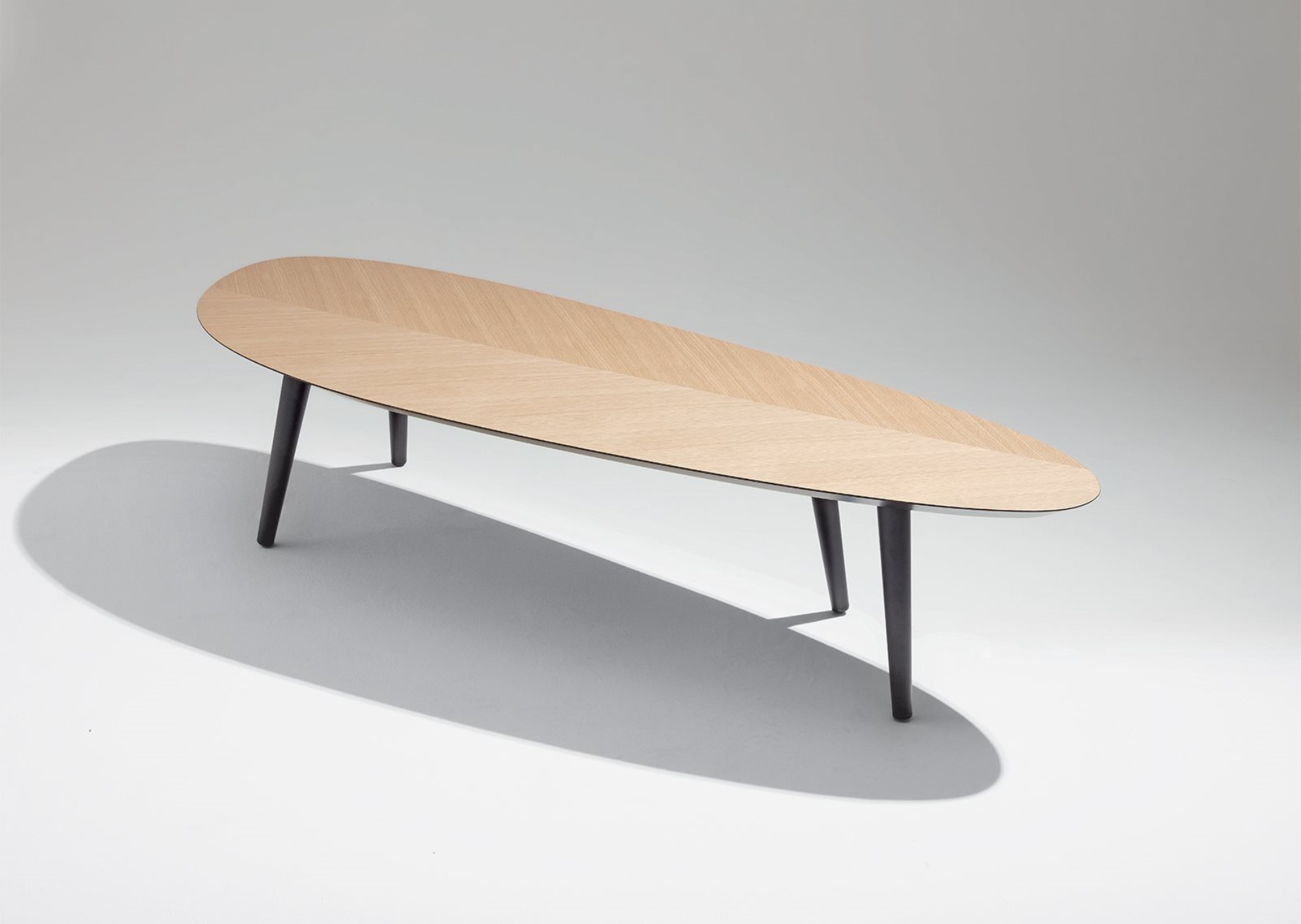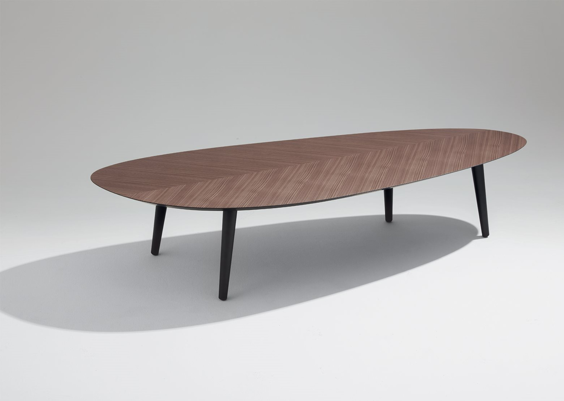 Three new coffee tables designed to complete large sofa islands and offer a practical surface at various heights. The surface stands out for the inlaid processing crafted diagonally with a specular game of outstanding precision which lends it an unusual perception, which is different every time depending on the observation point: the thin sheets of solid oak wood or Canaletto walnut wood are carefully placed side by side until the natural lines in the wood create a graphic sign in continuity with the diagonal line that separates the two parts of the table top, almost as if it were forming the veins on a leaf.