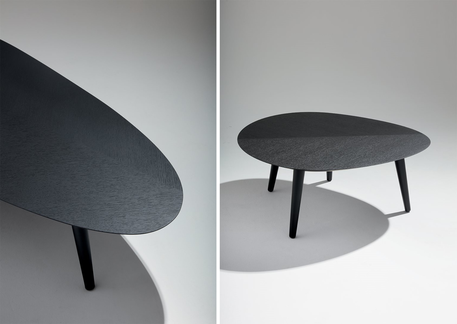 The coffee tables are available in three sizes. They can be used individually or teamed together playing with various heights to allow the partial overlapping of the table tops to create more articulate compositions with a strong scenic impact. There are three or four legs depending on the size of the table top, to guarantee proper stability. They are slightly slanted and wedge-shaped, made of tubular metal and welded to a matt black plate which allows them to be secured to the underside of the table top. The coffee tables complete the Tweed family of tables which was launched in 2017 matching their shapes, materials and finishes.