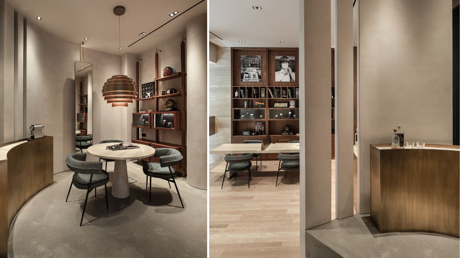 A private, circular second level on the right features a central marble table for samples and a split perimeter wall for visibility and isolation. The material palette includes marble, wood, leather, and bronze, creating a backdrop that highlights the products and immerses visitors in a narrative.
