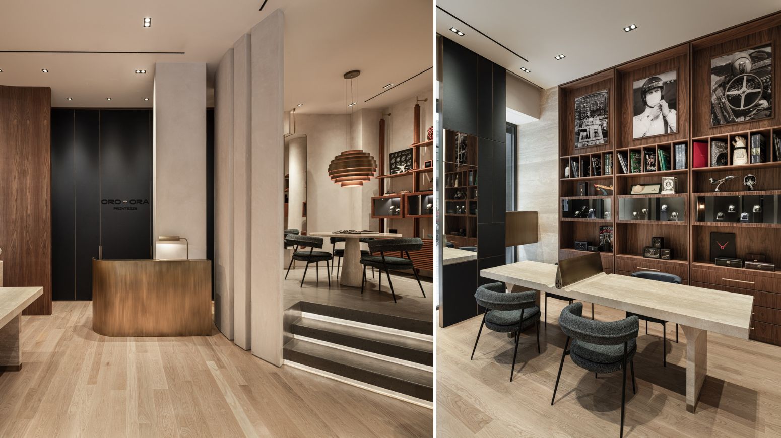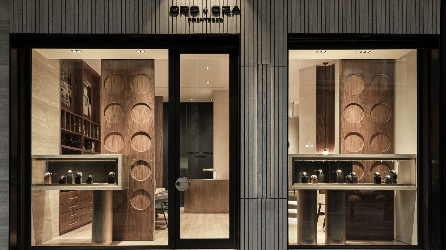 Minas Kosmidis Architects redesigned the 50 m² Oro e Ora Printezis store in Athens, which sells luxury watches. The design, inspired by the linearity of time and the circularity of a watch, features straight lines and circular elements. Visitors enter to find an elongated marble table on the left for product displays, with a bookcase behind it that serves as both a display and a cabinet of curiosities.